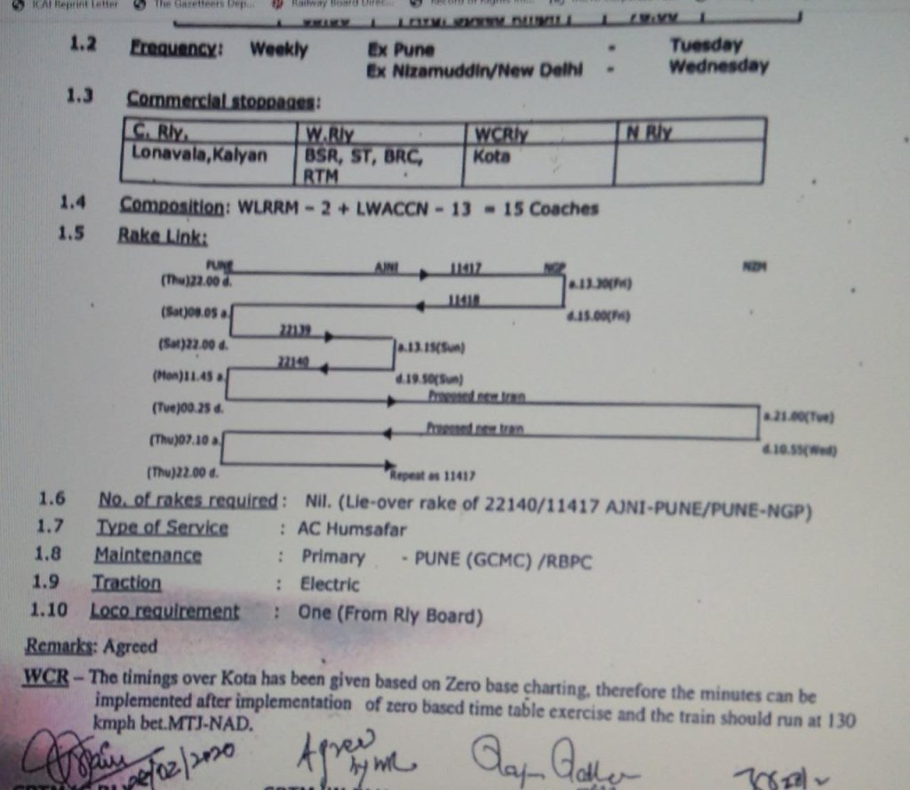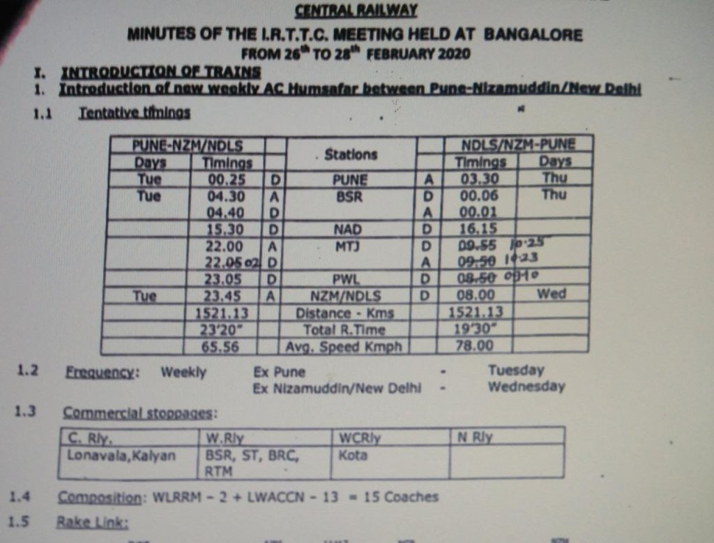 14 : नई गाड़ी पुणे निजामुद्दीन पुणे के बीच एक नई साप्ताहिक हमसफ़र एक्सप्रेस शुरू की जा रही है। यह गाड़ी पुणे से दिल्ली के बीच यात्रिओंकी बेहद माँग के ऊपर मिली है, लेकिन गाड़ी के टाइमिंग्ज को देखते हुए आसानी से समझ आता है की गाड़ी दिल्ली वालोंके लिए सुटेबल है, पुणेकर के लिए नही खैर। पुणे दिल्ली के बीच पहले भी एक वातानुकूलित साप्ताहिक गाड़ी चलती है जिसे हरिद्वार तक विस्तारित किया जा रहा है इसीलिए एक गाड़ी इस रुट के लिए मिल गयी। परिचालन का कुल समय बढ़िया है। यह गाड़ी की खास बात यह है, कुछ सेक्शन में यह गाड़ी 130 kmph से चलाई जाने वाली है।