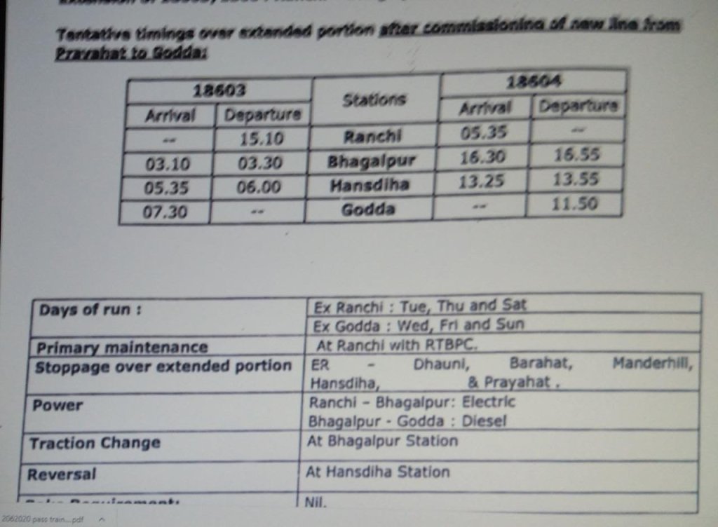 15: 18603 / 04 राँची भागलपुर राँची एक्सप्रेस का नई लाइन कार्यान्वित होने के बाद हंसाडीह के रास्ते गोड्डा तक विस्तार