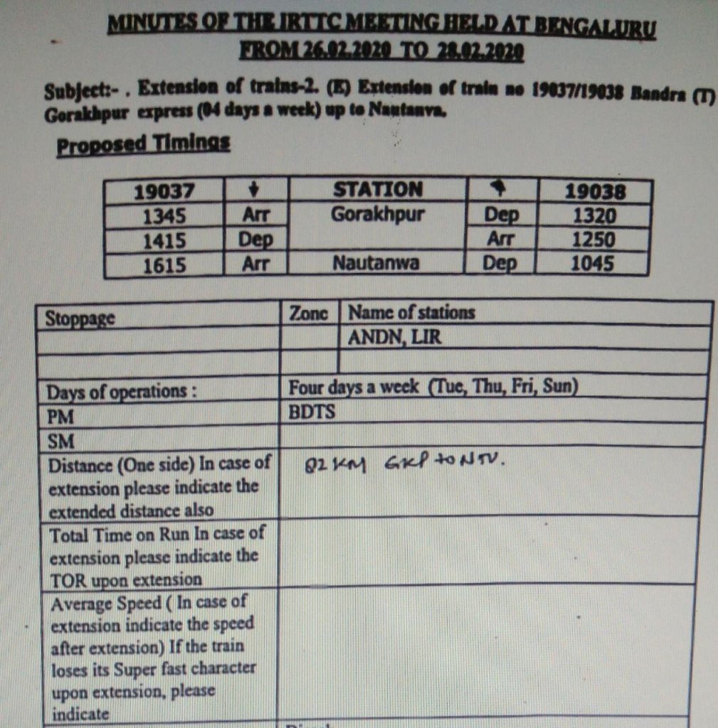 19 : 19037/38 बांद्रा गोरखपुर बांद्रा अवध एक्सप्रेस का गोरखपुर से नौतनवा तक विस्तार