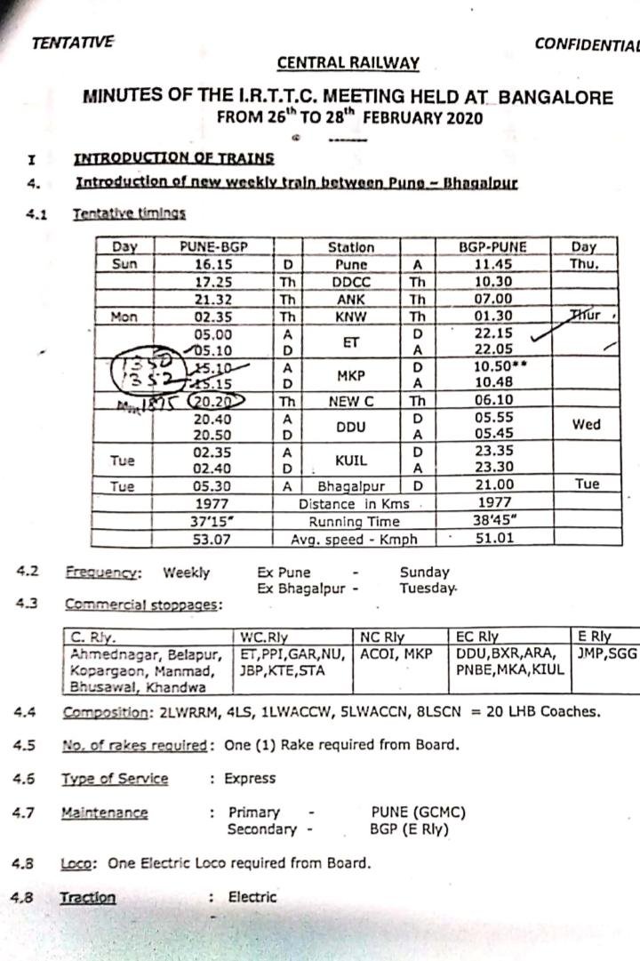 पुणे से भागलपुर के बीच एक नई साप्ताहिक गाड़ी चलाने को मंजूरी मिली।