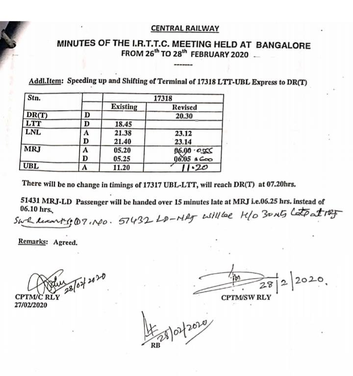 17318 लोकमान्य तिलक टर्मिनस हुब्बाल्ली एक्सप्रेस स्पीड अप की जा रही है, कृपया बदले समयपर ध्यान दें। 17317 हुब्बाल्ली लोकमान्य तिलक टर्मिनस एक्सप्रेस में समय के बदलाव का कोई प्रस्ताव नही है।