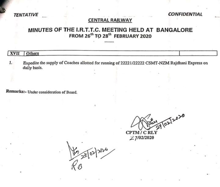 22222 / 22221 मुम्बई छत्रपति शिवाजी महाराज टर्मिनस और निजामुद्दीन के बीच चलनेवाली मध्य रेलवे की एकमेव राजधानी जल्द ही रोजाना चलने लगेगी। यह मध्य रेलवे का प्रस्ताव स्वीकृत हो गया है, बस डिब्बों का रैक उपलब्ध होते ही इस गाड़ी के फेरे बढ़कर रोजाना हो जाएगी।