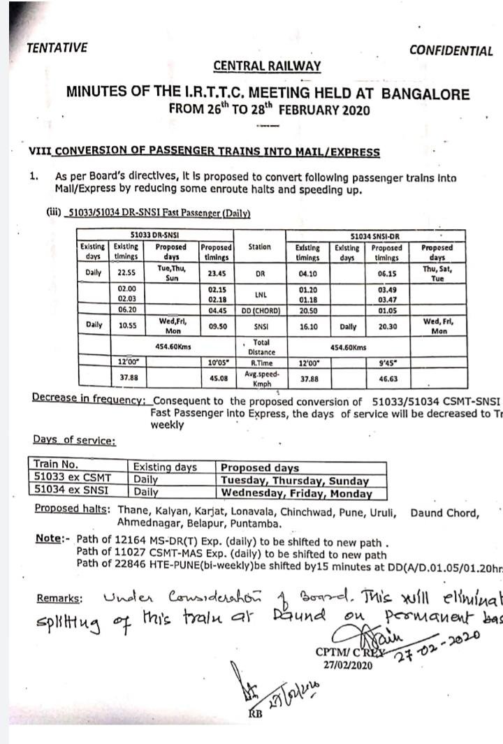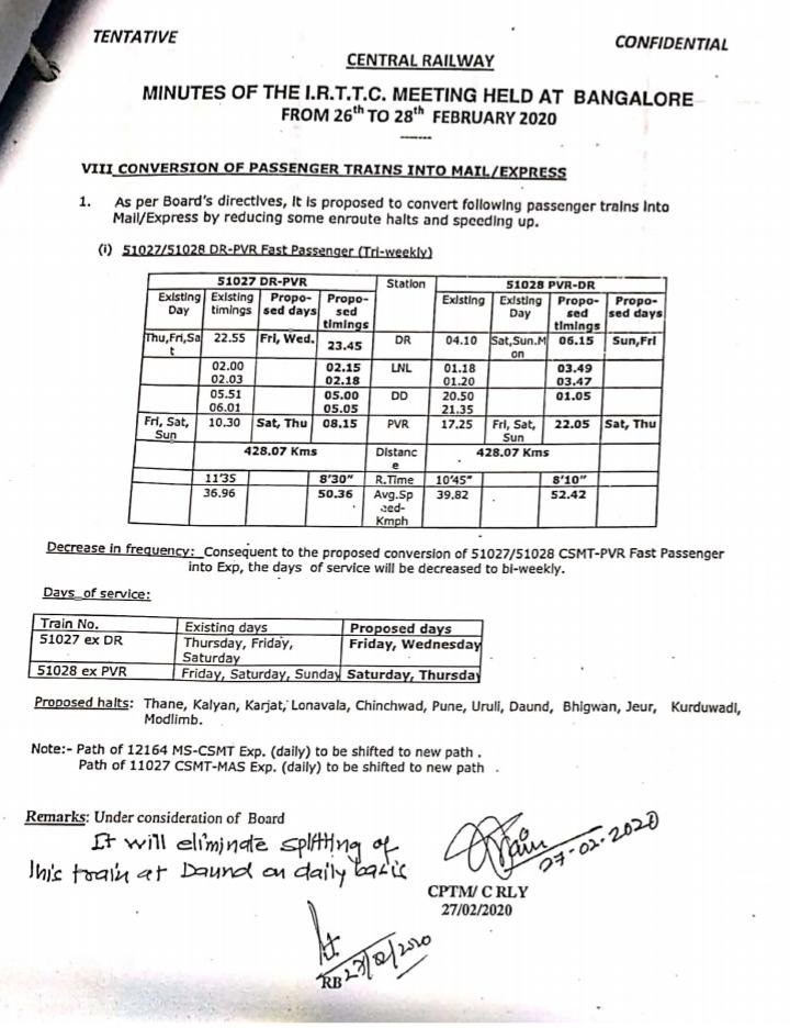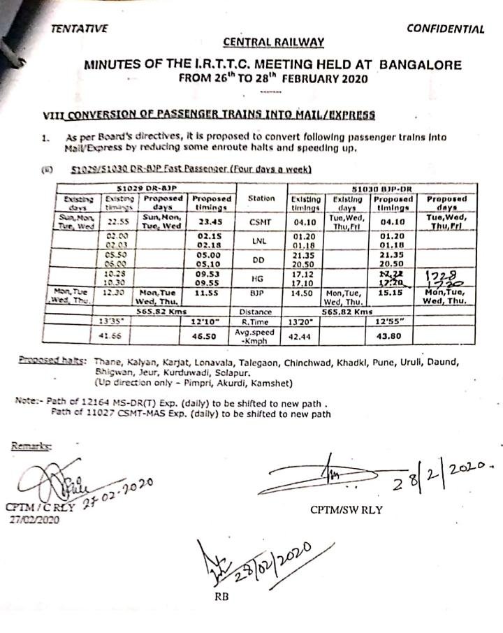 मुम्बई छत्रपति शिवाजी महाराज टर्मिनस से विजयपुरा और पंढरपुर के बीच चलनेवाली सवारी गाड़ी को एक्सप्रेस में कन्वर्ट किया जाएगा। ध्यान रहे इन गाड़ियोंके साथ कुछ डिब्बे दौंड में कट कर साई नगर शिरडी भी एक रोजाना लिंक एक्सप्रेस बन कर जाते थे। अब नई व्यवस्था में इन गाड़ियोंके साथ व्यापक बदलाव किए जाएंगे। शिरडी लिंक पैसेंजर बन्द होकर सेपरेट एक्सप्रेस बन कर चलेगी जो कि द्विसाप्ताहिक रहेगी। निम्न लिखित तीनों परीपत्रक देख लीजिए आप को पूरी स्थिति समझ आ जाएगी।