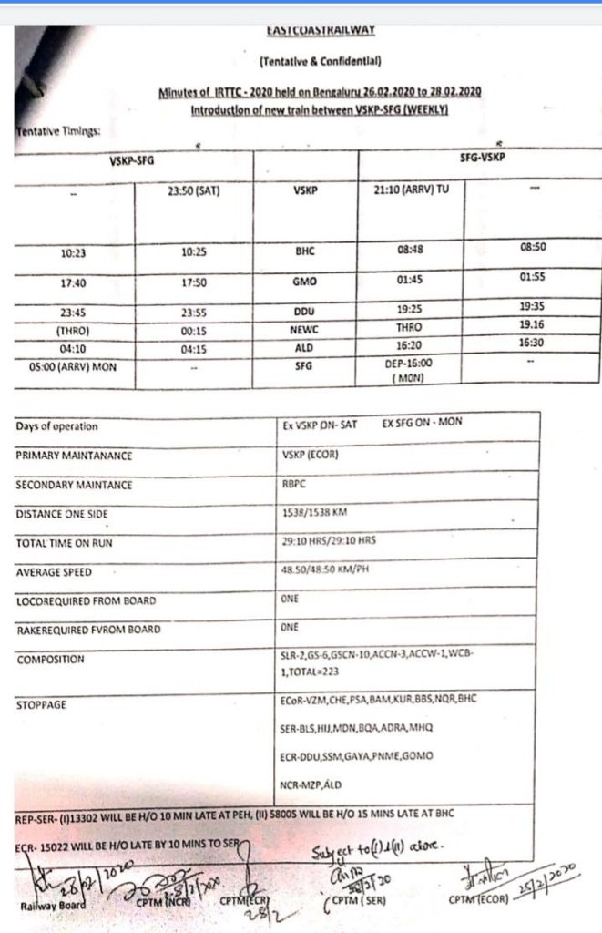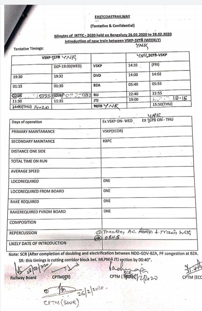 विसाखापट्टनम से एलहँका के बीच नई साप्ताहिक गाड़ी को मंजूरी मिल गयी है, हालांकि मार्ग पर कुछ डेवलपमेंट जारी होने से देरी हो सकती है।