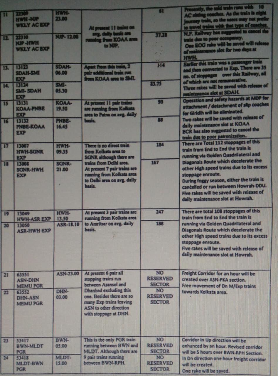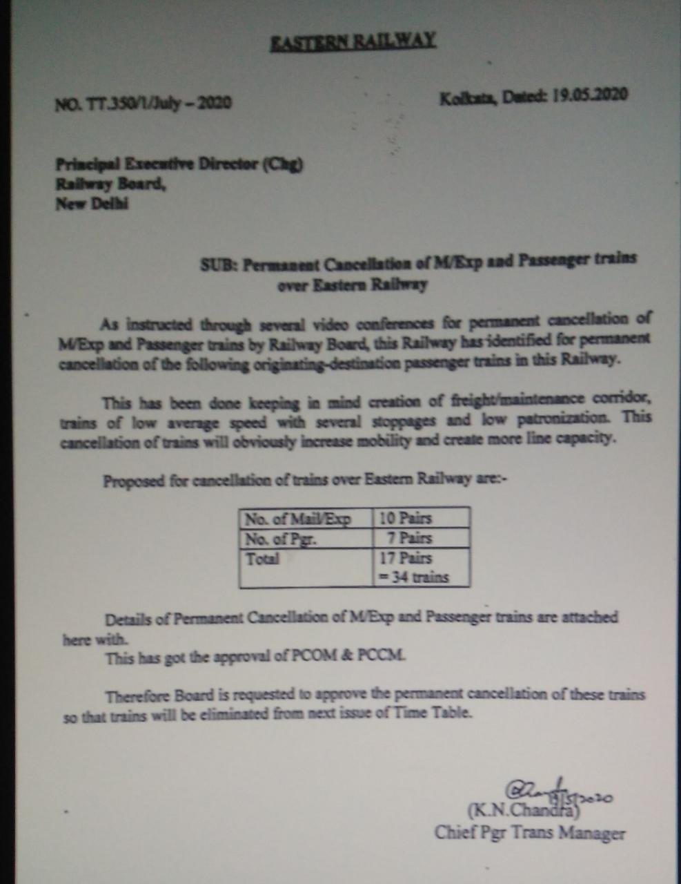 पूर्व रेलवे के ऐसे प्रस्ताव को देखते हुए यह लग रहा है, बचे 17 क्षेत्रीय रेलवे में भी इसी तरह के, कम उत्पन्न देने वाली गाड़ियोंकी पुनर्रचना या रद्द किए जाने के प्रस्ताव लाए जा सकते है। फिलहाल आप परीपत्रक देख लीजिए।