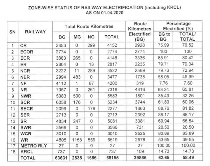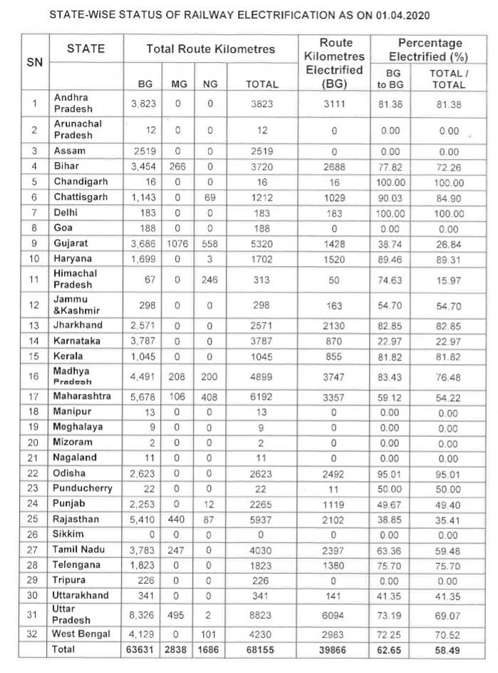 1925 से शुरू हुई यह विद्युतीकरण की रेलवे यातायात 1500 वोल्ट डायरेक्ट करन्ट याने DC से चलती थी। मुम्बई से पुणे और मुम्बई से इगतपुरी ऐसे दो मार्गोपर यह ट्रैक्शन था। 1957 में रेलवे ने DC विद्युतीकरण के बजाय 25 केवी इलेक्ट्रिक ट्रैक्शन पर काम करना शुरू किया और 1 अप्रैल 2020 तक भारतीय रेलवे का 39866 किलोमीटर मार्गका विद्युतीकरण हो चुका है। हमारे पास दो चार्ट है, पहला रेलवे का राज्यनिहाय विद्युतीकरण और दूसरा क्षेत्रीय रेलवे के अनुसार विद्युतीकरण। आइए देखते है। यह चार्ट्स भारतीय रेल की वेबसाइट से लिए गए है।