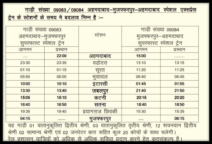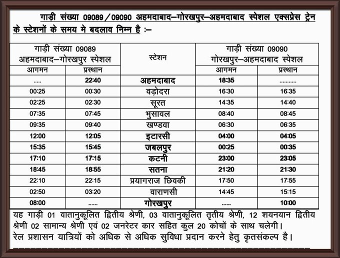 09089 / 09090 अहमदाबाद गोरखपुर अहमदाबाद स्पेशल और 09083 / 09084 अहमदाबाद मुजफ्फरपुर अहमदाबाद स्पेशल इन गाड़ियोंके समय आजसे दिनांक 01 जुलाई से बदले है।