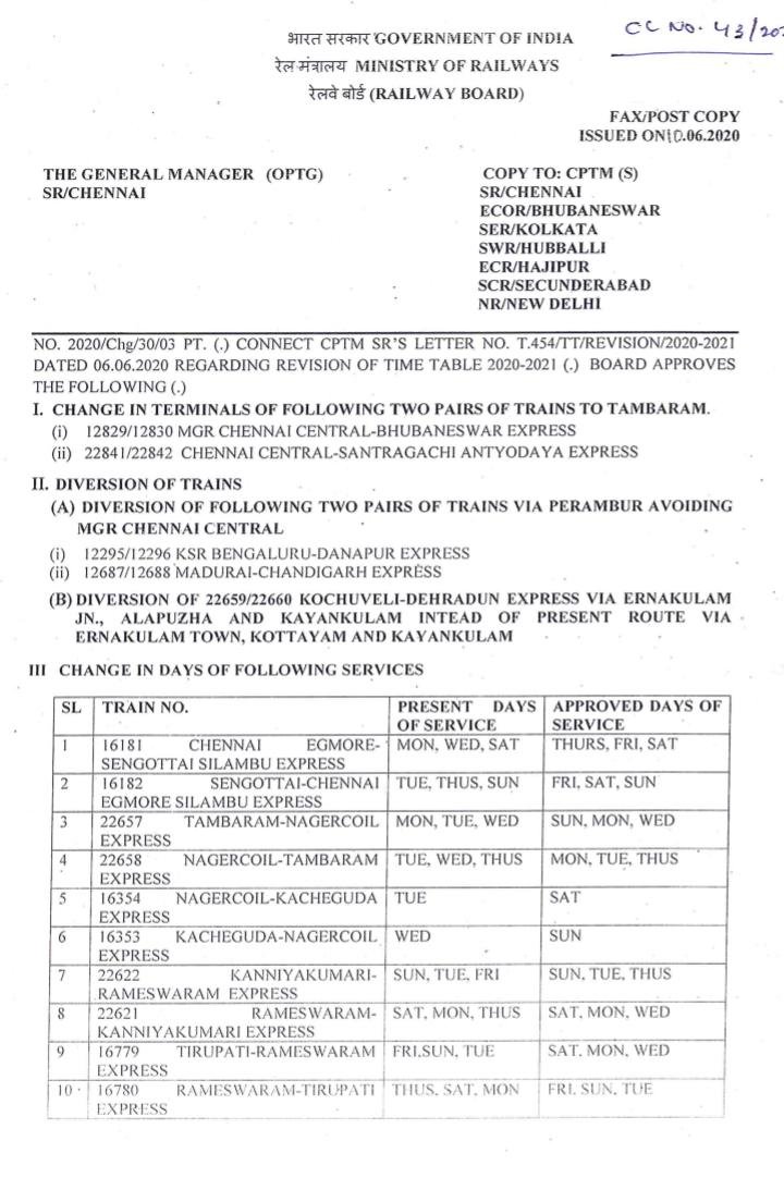 वर्ष 2020/21 के रेलवे टाइमटेबल बदलाव के परीपत्रक आने शुरू हो गए है। दक्षिण रेलवे क्या कुछ होनेवाला है यह देखते है।