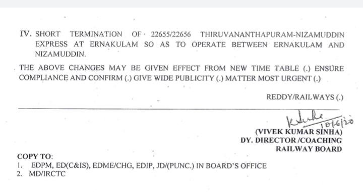 22655 / 22656 तिरुवनंतपुरम निजामुद्दीन तिरुवनंतपुरम एक्सप्रेस अब सिर्फ एर्नाकुलम तक ही चलाई जाएगी याने अब यह गाड़ी एर्नाकुलम निजामुद्दीन एर्नाकुलम एक्सप्रेस रहेगी।