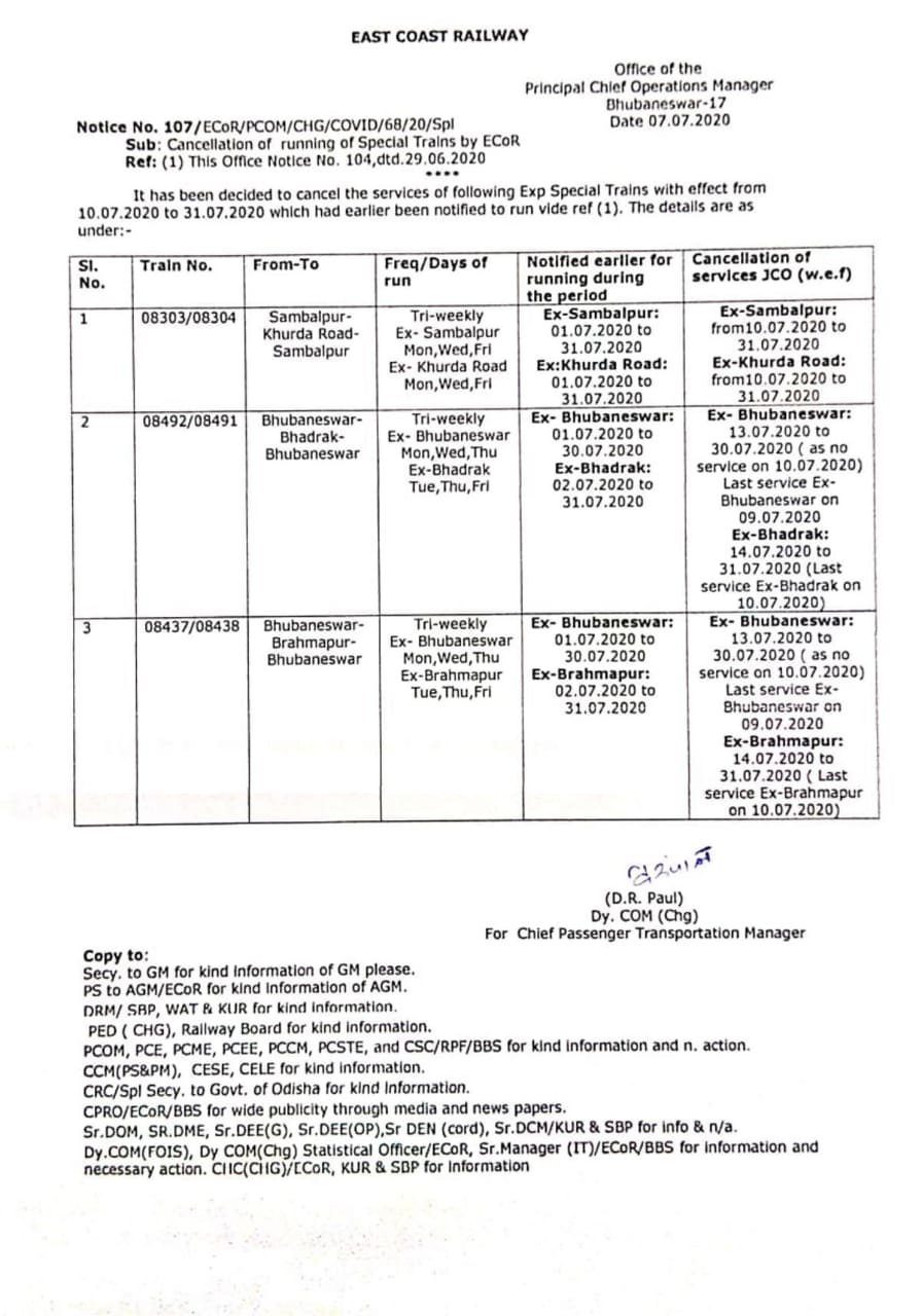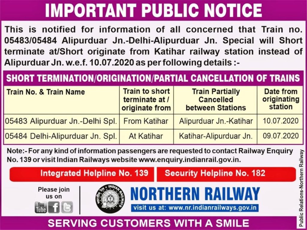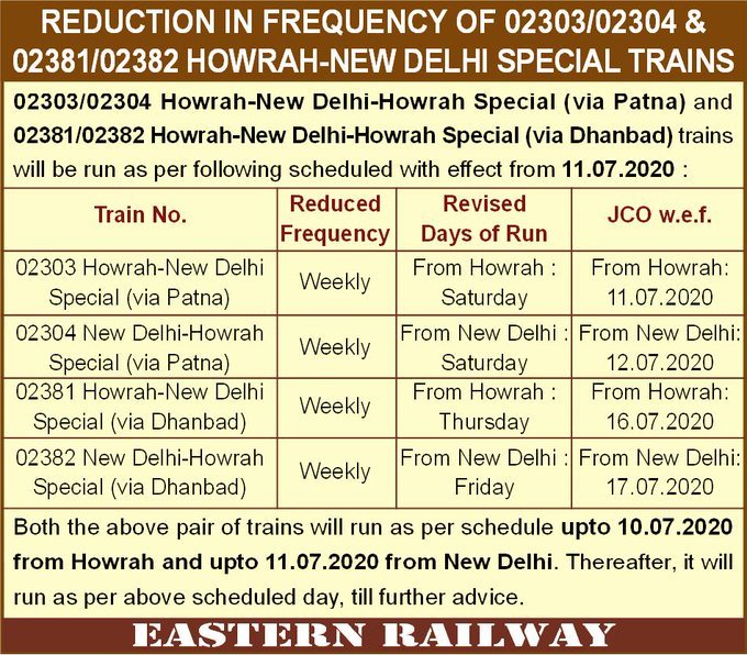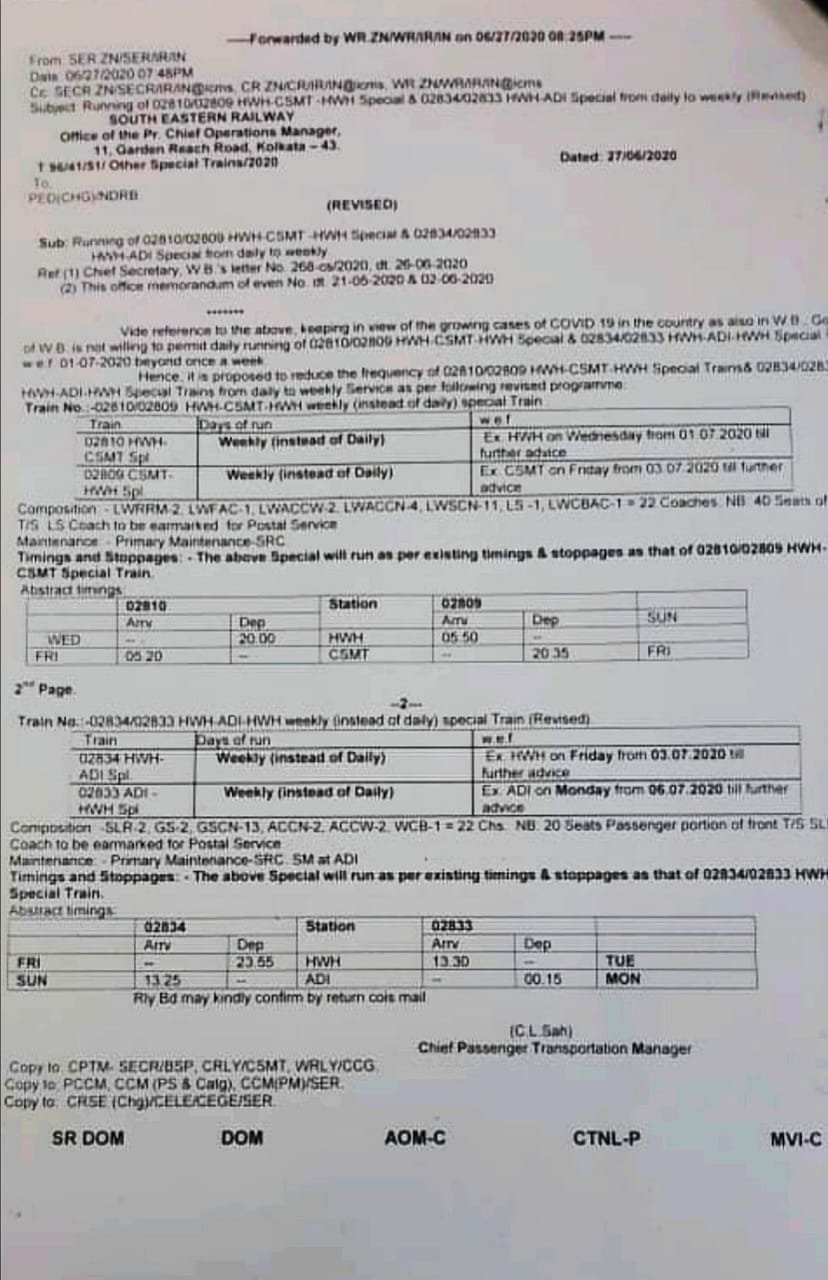 निम्नलिखित परिपत्रकों को ध्यान से पढ़ लीजिए और सेवाओंके दिन भी समझ लीजिएगा। उक्त गाड़ियाँ अब केवल साप्ताहिक ही चलेगी और इंटरसिटी गाड़ियाँ रद्द की जा रही है।