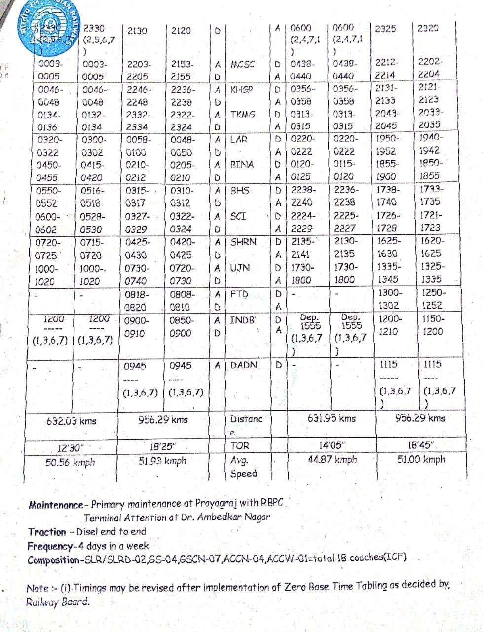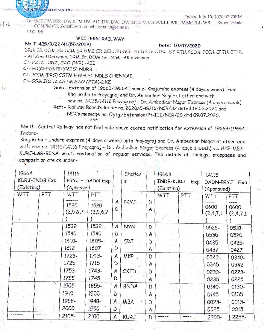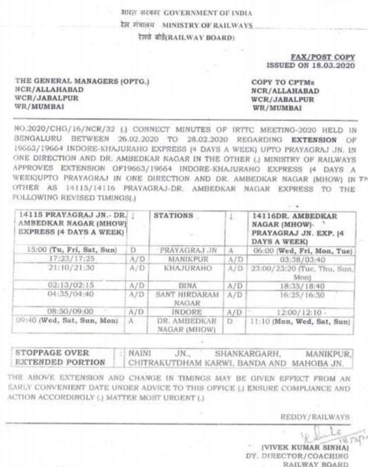 पश्चिम रेलवे रतलाम मंडल के इंदौर से खजुराहो के मध्य चलने वाली गाड़ी संख्या 19664/19663 खजुराहो-इंदौर-खजुराहो एक्सप्रेस का एक ओर प्रयागराज एवं दूसरी ओर डॉ अम्बेडकर नगर तक विस्तार किया गया है तथा यह ट्रेन सप्ताह में चार दिन नए नम्बर 14116/14115 प्रयागराज-डॉ अम्बेडकर नगर-प्रयागराज एक्सप्रेस के रूप में चलेगी।