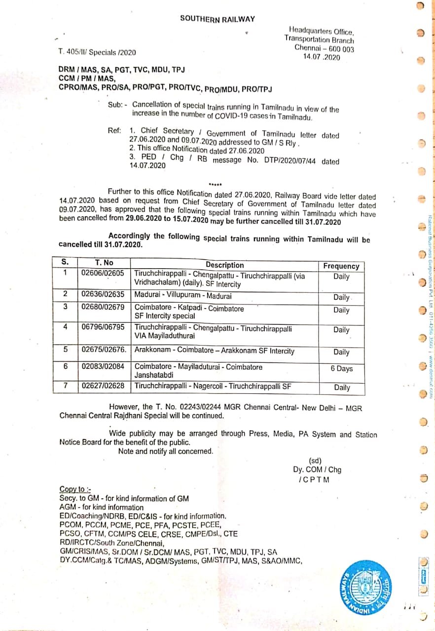 निम्नलिखित 7 जोड़ी गाड़ियाँ गत 29 जून से 15 जुलाई तक रद्द की गई थी, जिन्हें अब आगे और 31 जुलाई तक रद्द किया जा रहा है।
