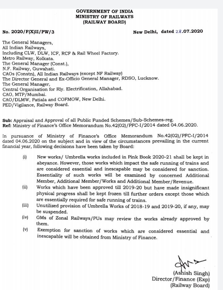रेल प्रशासन का एक पत्र हम आपको दिखा रहे है जिसमे पिंक बुक 2020 – 21 में शामिल किए गए नए कार्यों / अम्ब्रेला कार्यों को ठंडे बस्ते में रखा जाने की बात कही जा रही है। हालांकि, वे काम जो ट्रेनों के सुरक्षित चलने पर प्रभाव डालते हैं और जिन्हें आवश्यक माना जाता है और अपरिहार्य को मंजूरी के लिए माना जाता है। ऐसे कार्यों की अनिवार्यता की जांच संबंधित अतिरिक्त सदस्य, अतिरिक्त सदस्य / निर्माण और अतिरिक्त सदस्य / राजस्व द्वारा की जाएगी। जिन कार्यों को 2019-20 तक अनुमोदित किया गया है, लेकिन महत्वपूर्ण भौतिक प्रगति को आगे के आदेशों तक स्थिर रखा जाएगा, सिवाय उन लोगों को छोड़कर, जिन्हें आवश्यक रूप से ट्रेनों के सुरक्षित संचालन के लिए आवश्यक है। 2018 – 19 – 20 और 2020 – 21 के अम्ब्रेला वर्क्स का अप्रयुक्त प्रावधान, यदि कोई हो, निलंबित किया जा सकता है। क्षेत्रीय रेलवे / पीयू के जीएम उनके द्वारा पहले से स्वीकृत कार्यों की समीक्षा कर सकते हैं। आवश्यक और अपरिहार्य माने जाने वाले कार्यों की स्वीकृति के लिए छूट वित्त मंत्रालय से प्राप्त की जाएगी।