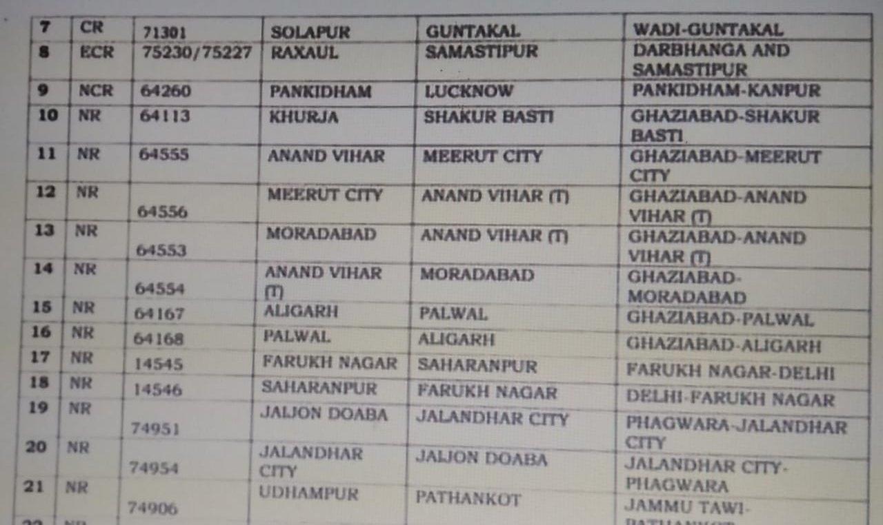 21,22: 74906/07 उधमपुर जम्मूतवी चलेगी, जम्मूतवी पठानकोट के बीच रद्द रहेगी।