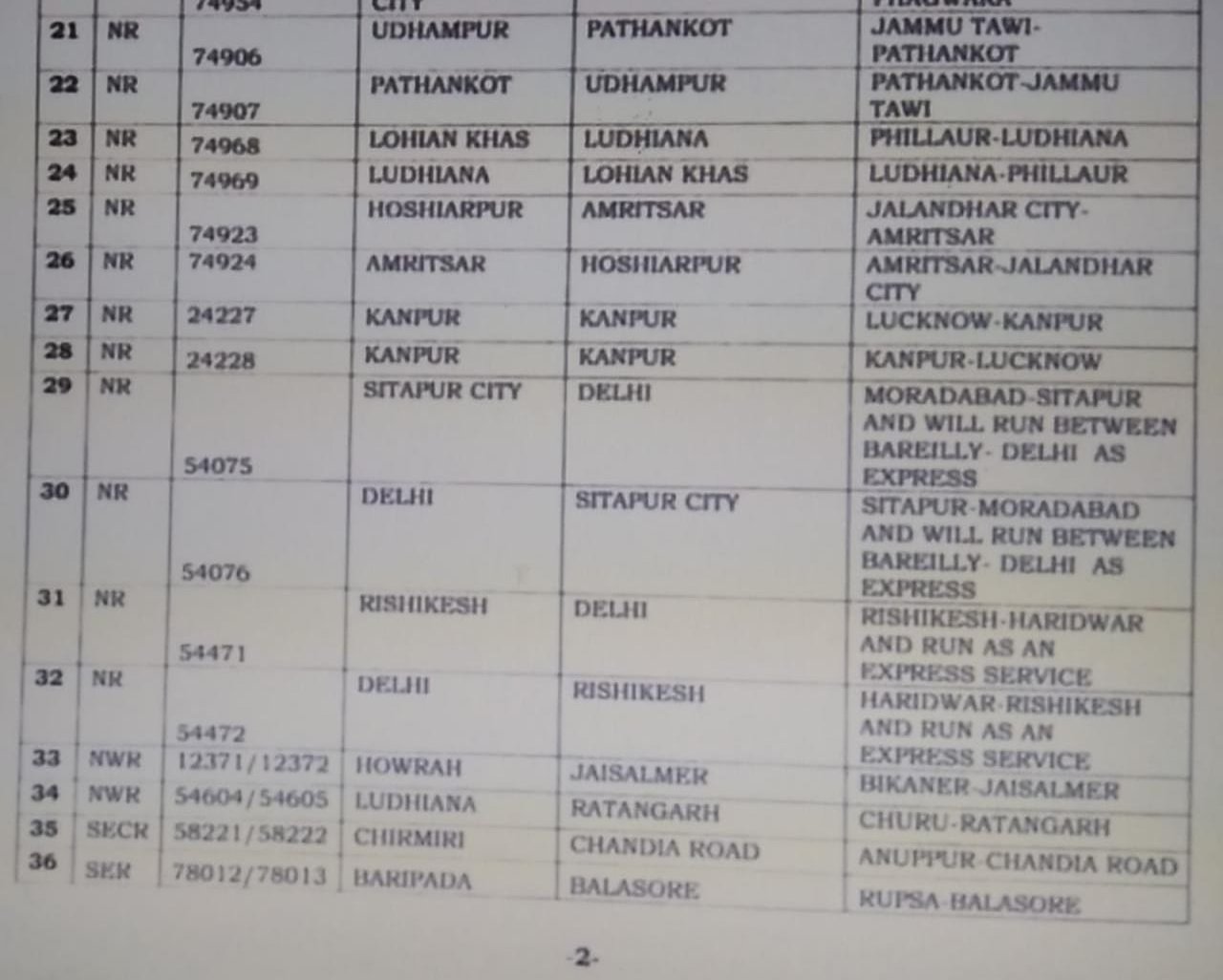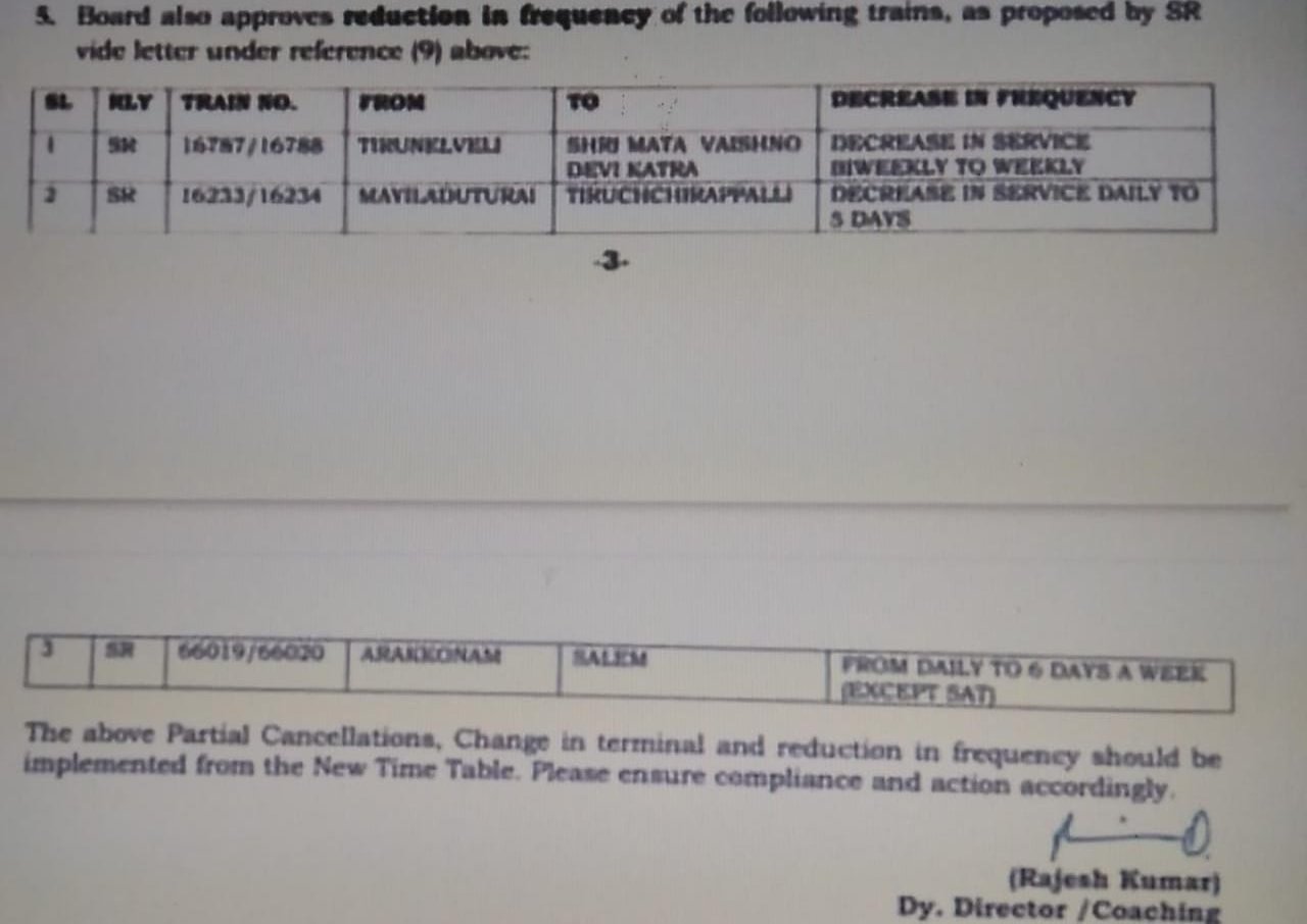 1: 16787/88 तिरुनेलवेली श्री माता वैष्णो देवी कटरा तिरुनेलवेली एक्सप्रेस द्विसाप्ताहिक की जगह सप्ताह में केवल एक दिन चलेगी।