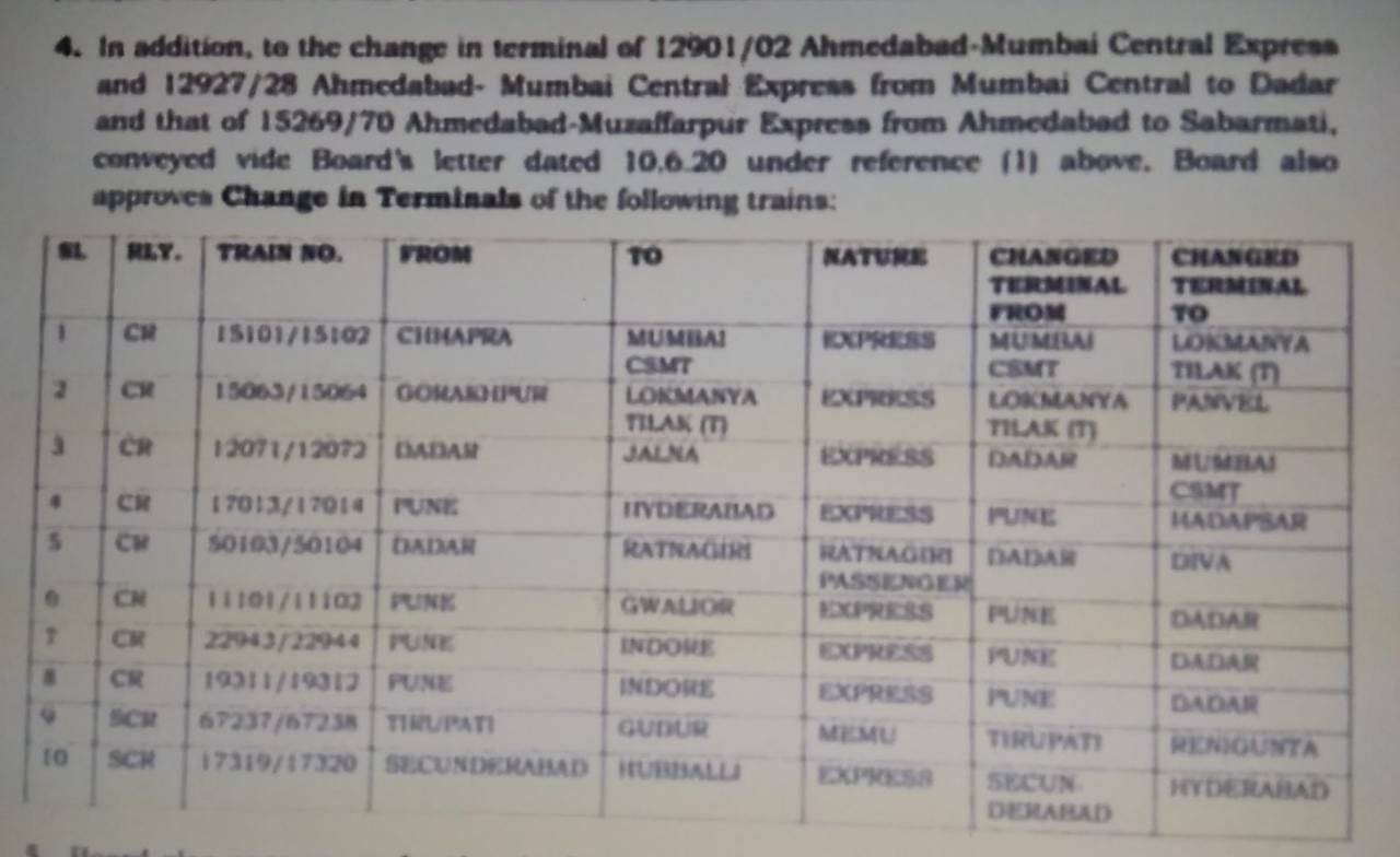 6: 11101/02 पुणे ग्वालियर पुणे एक्सप्रेस, 7: 22943/44 और 8: 19311/12 पुणे इंदौर पुणे सुपरफास्ट और एक्सप्रेस यह गाड़ियाँ पुणे के बजाय दादर को…..