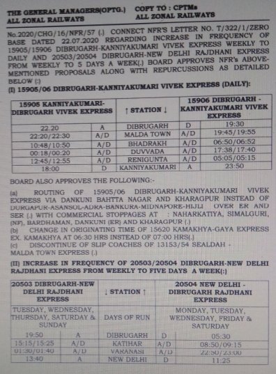 15905/06 डिब्रूगढ़ कन्याकुमारी डिब्रूगढ़ विवेक एक्सप्रेस जो साप्ताहिक चलती थी, सप्ताह में 5 दिन चलाया जाएगा