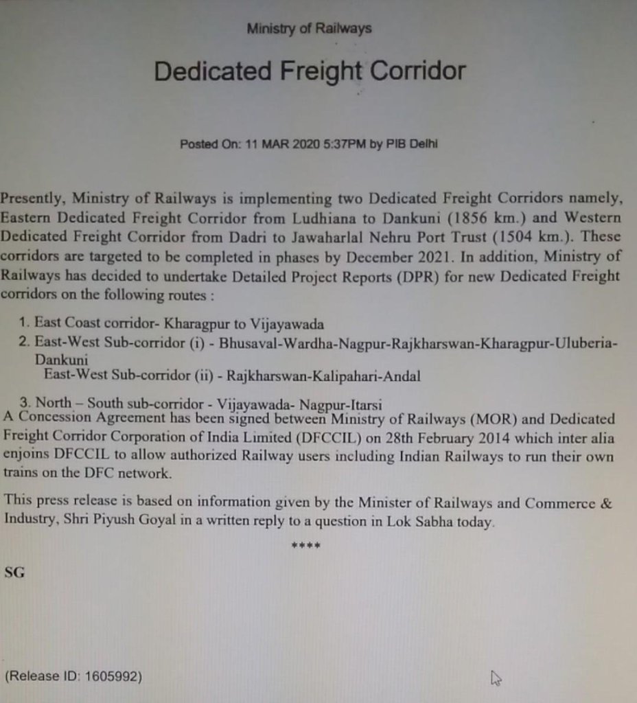 रेलवे का महत्वाकांक्षी प्रकल्प, डेडिकेटेड फ्रेट कॉरिडोर के दो प्रोजेक्ट्स EDFC लुधियाना से दानकुनी 1856 किलोमीटर और WDFC दादरी से मुम्बई के JNPT 1504 किलोमीटर पर ज़ोरोंसे काम शुरू है। दिसम्बर 2021 तक यह दोनोंही प्रोजेक्ट लगभग पूरे किए जाने की संभावनाएं है। इन रेलवे कोरिडोर बन जाने से दिल्ली – हावड़ा, दिल्ली मुम्बई के बीच मालगाड़ियोंके चलाए जाने के लिए एक स्वतंत्र व्यवस्था हो जाएगी। साथ ही वर्तमान व्यवस्थाओंके के लिए अतिरिक्त मार्ग भी उपलब्ध हो जाएगा। बहोत ही अत्याधुनिक एवं उन्नत तरीकेसे बनाया गया यह मार्ग भारत के लिए विकास के नए मार्ग खोलने वाला साबित होने वाला है यह बात तय है।