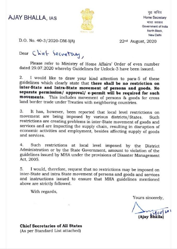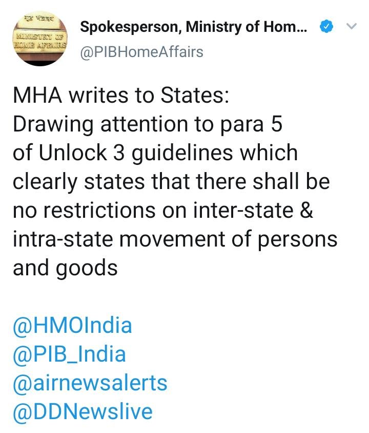 भारत सरकार के गृह मंत्रालय ने राज्यशासनों, जिला प्रशासनों की ओरसे जारी, इस तरह के निर्बंधोंपर बड़ी गंभीरता से दखल ली है और आज राज्योंके मुख्य सचिवोंके नाम एक ट्वीट किया है, जिस मे सभी राज्य शासन को आवाहन किया है, राज्यान्तरिक और अन्तर्राज्यीय यातायात के सभी निर्बंध खोल दिए जाने चाहिए, जिससे देश की अर्थव्यवस्था को बाधा पोहचती हो। आशा है, राज्य शासन इस आवाहन पर यथायोग्य प्रतिक्रिया दे और अपनी ओर से जारी निर्बंधोपर उचित निर्णय ले। साथ मे, गृह मंत्रालय की ओरसे जारी ट्वीट और पत्र जो की अनलॉक -3 दिनांक 29 जुलाई 2020 को जारी किया गया है वह भी देख लीजिए।