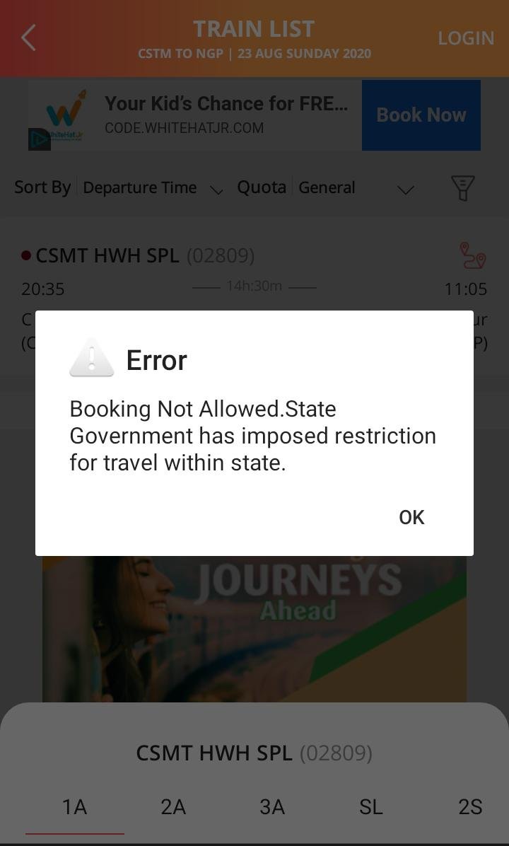 महाराष्ट्र राज्य अंतर्गत रेल यात्रा को महाराष्ट्रवासियों को मनाही है। राज्य शासन ने रेल प्रशासन की टिकट बुकिंग व्यवस्था को हिदायत देकर ऐसे निर्बंध डाल रखे है, की आप महाराष्ट्र के किसी भी शहर से महाराष्ट्र के अंतर्गत रेल टिकट बुक नही करा सकते, न ही यात्रा करने का सोच सकते है।