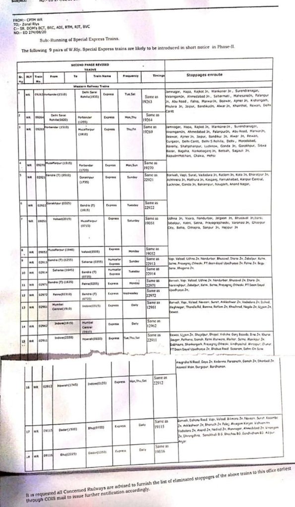पश्चिम रेलवे ने अपनी 9 जोड़ी गाड़ियोंकी लिस्ट तैयार की है। ब्रेकैट में वह ट्रेन नम्बर, जिस के स्टापेजेस, सेवा के दिन और समयसारणी नुसार स्पेशल गाड़ी चलेगी।