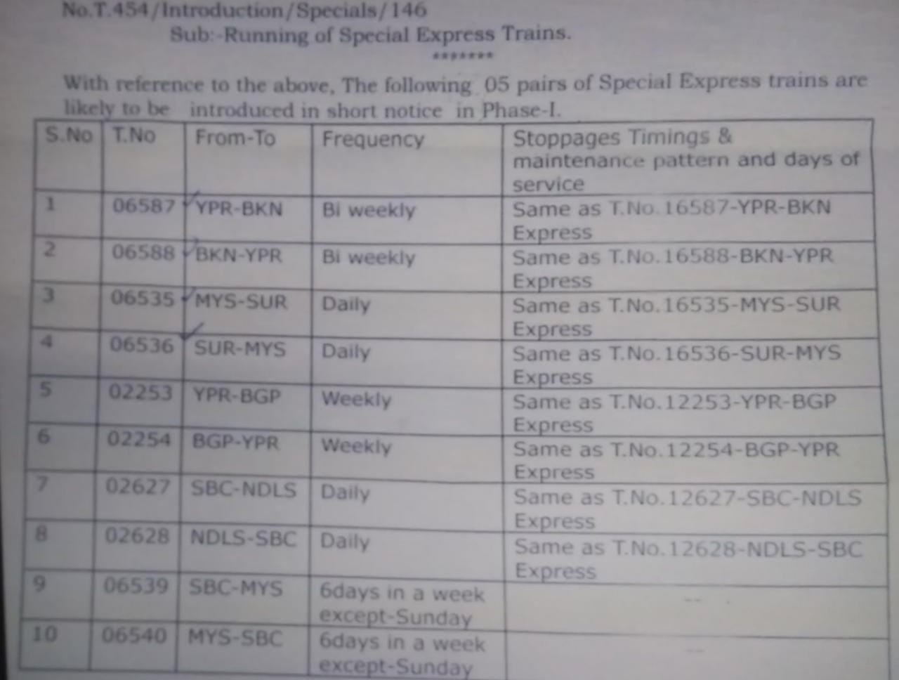 दक्षिण पश्चिम रेलवे की 5 जोड़ी सम्भावित गाड़ियाँ