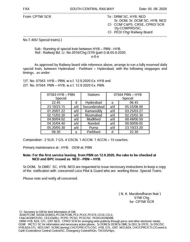 07563/64 हैदराबाद परभणी हैदराबाद डेली ओवरनाइट स्पेशल जिसका आरक्षण दिनांक 10 सितम्बर से शुरू होगा और संचालन दिनांक 12 सितंबर से। इस गाड़ी में 1 वातानुकूलित 2 टियर, 1 वातानुकूलित 3 टियर, 4 स्लिपर, 7 सेकेंड सिटिंग और 2 एसएलआर रहेंगे। गाड़ी फ़ुल्ली आरक्षित आसन व्यवस्था वाली रहेगी।