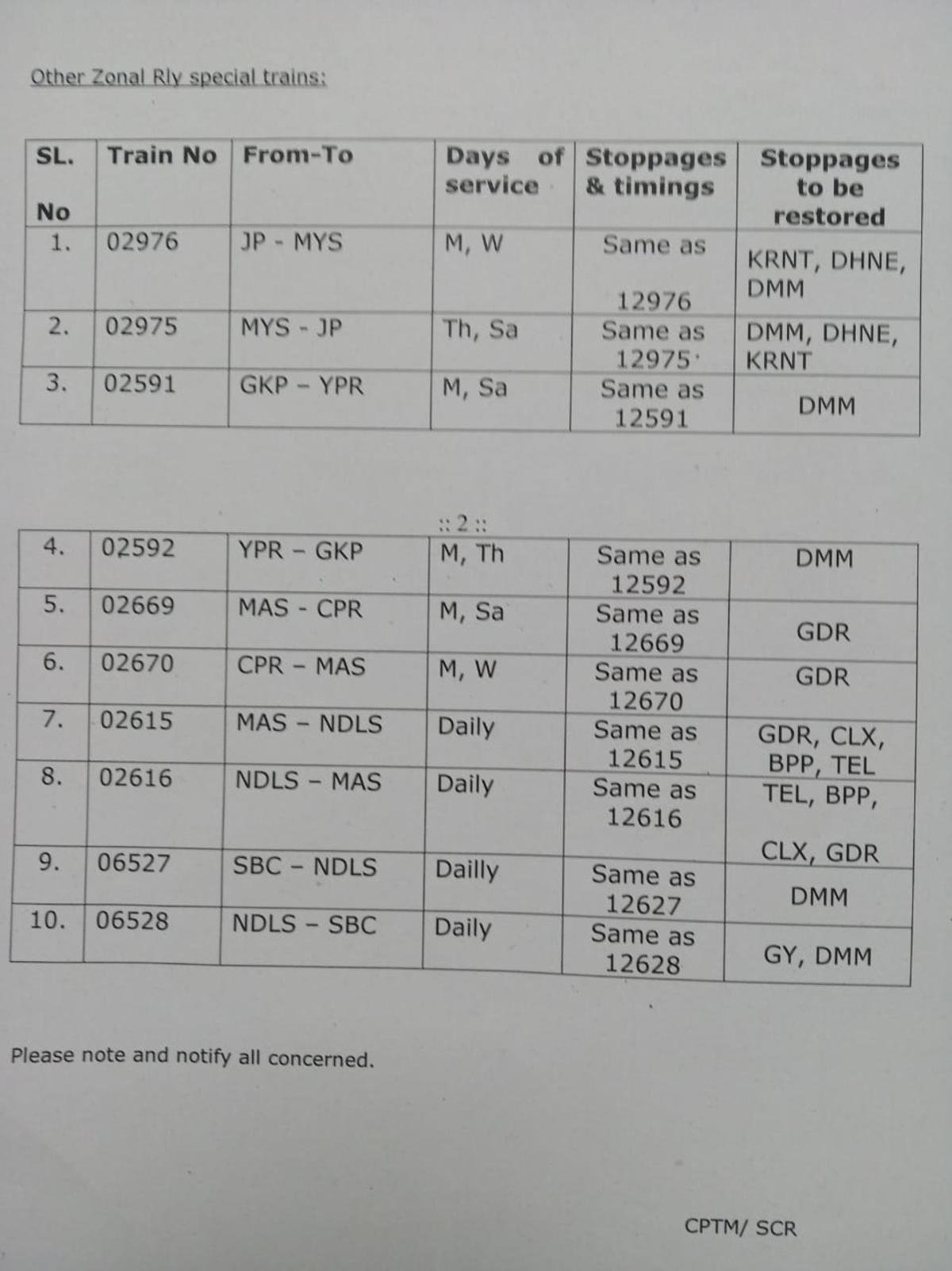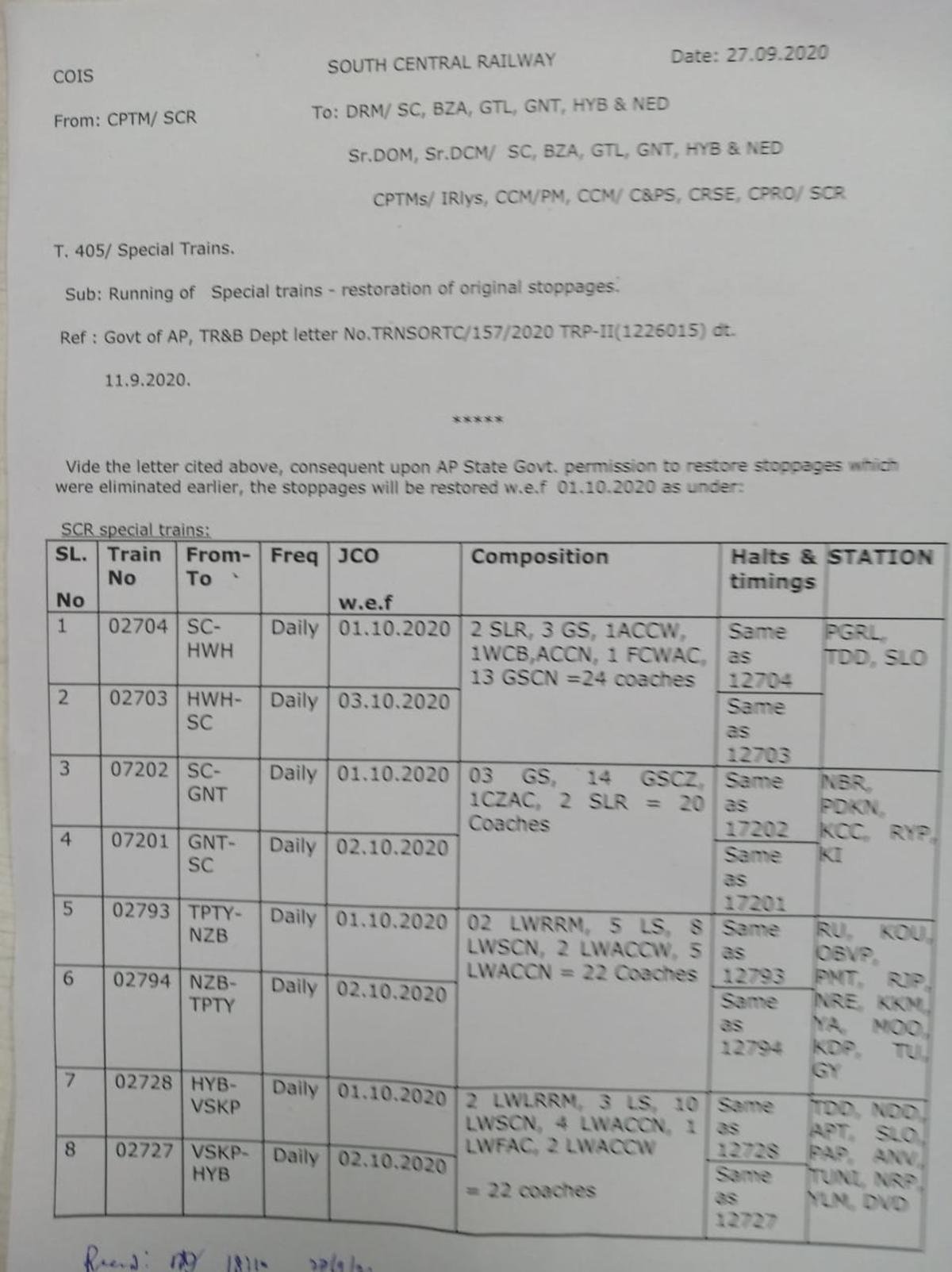 आंध्रप्रदेश राज्य शासन ने रेलवे से गुज़ारिश की है की वह अपनी निम्नलिखित गाड़ियोंके स्टापेजेस को रीस्टोअर याने पुनर्स्थापित कर दे, ताकि मार्ग के यात्रिओंको रेल गाड़ियोंकी व्यवस्था मिल सके। यह सभी स्पेशल गाड़ियोंके स्टापेजेस आंध्र शासन ने ही रद्द करवाए थे। अब यह सारी स्पेशल गाड़ियाँ, अपने नियमित क्रमांक से चलनेवाली गाड़ियोंके भांति स्टापेजेस लेंगी। कृपया निम्नलिखित परीपत्रक देख ले।