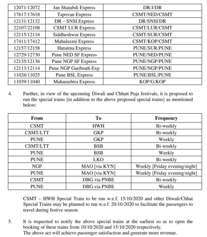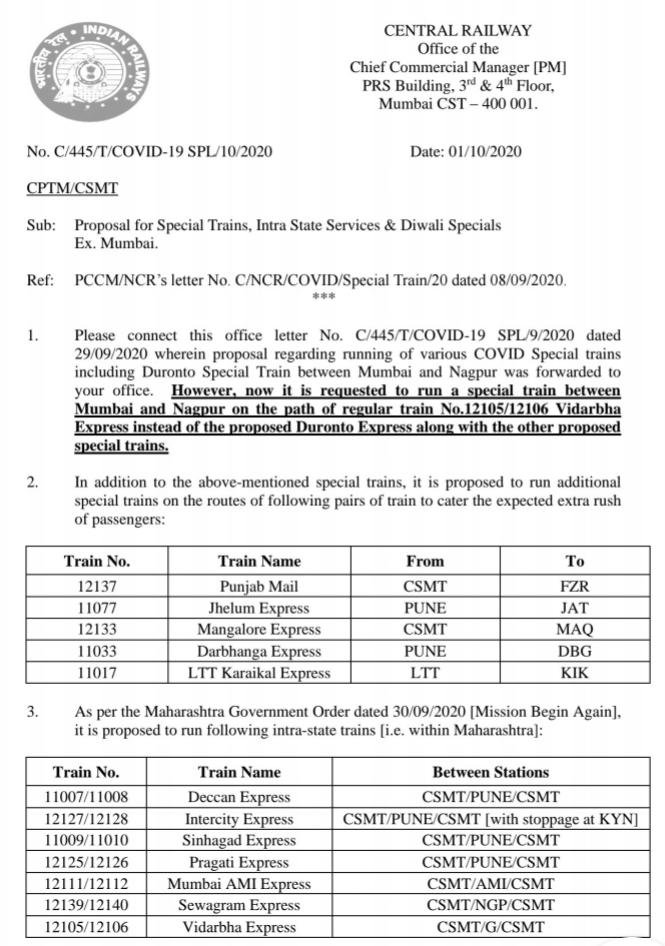 मध्य रेलवे ने महाराष्ट्र राज्यान्तर्गत शुरू की जानेवाली सम्भावित गाड़ियोंकी लिस्ट जारी कर दी है, साथ ही त्योहार, उत्सव स्पेशल गाड़ियाँ कौनसे स्टेशनोंके बीच चलेगी यह भी नियोजन कर लिया है। है, न भाईयों बल्ले बल्ले वाली ख़बर!!