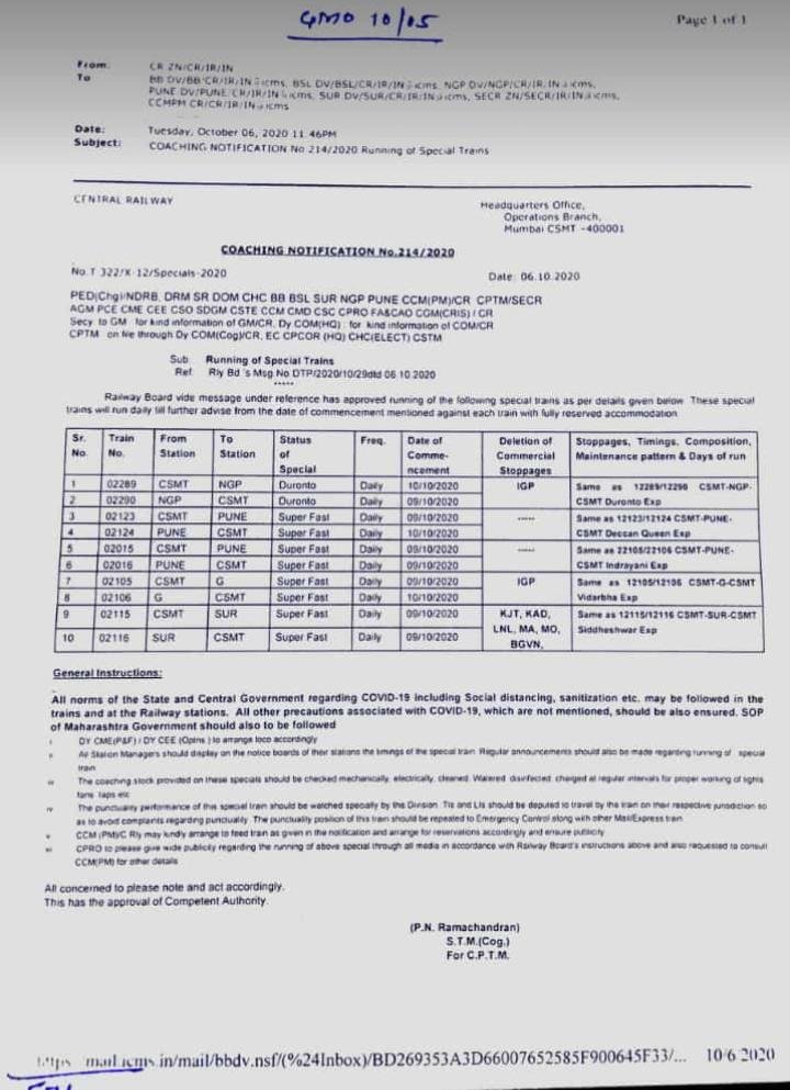 जी, जी। मध्य रेलवे भी अपनी गाड़ियोंकी फ्लीट पटरियोंपर दौड़ाने तैयार है। लीजिए 5 जोड़ी प्रतिदिन गाड़ियोंके साथ शुरवात होने जा रही है। यह सभी गाड़ियाँ 9/10 अक्तूबर से स्पेशल श्रेणी में, केवल आरक्षित आसन व्यवस्था के शुरू की जा रही है। स्टापेजेस और शेड्यूल नियमित गाड़ियोंके जैसे ही रहेंगे मात्र ताजा सूचनाओंके लिए रेलवे हेल्पलाइन 139 से जानकारी लेकर ही अपनी यात्रा का नियोजन करे।