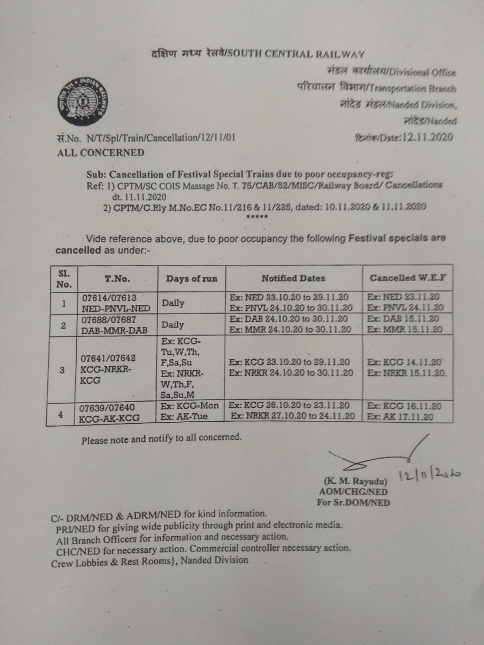 इन रद्द गाड़ियोंमे, 07641/42 काचेगुड़ा नरखेड़ काचेगुड़ा सप्ताह में 6 दिन, 07639/40 काचेगुड़ा अकोला काचेगुड़ा साप्ताहिक, 07687/88 मनमाड़ धर्माबाद मनमाड़ प्रतिदिन, 07613/14 पनवेल नान्देड पनवेल, 02705/06 विसाखापट्टनम विजयवाड़ा विशाखापट्टनम सप्ताह में पांच दिन, 07415/16 तिरुपति कोल्हापुर तिरुपति हरिप्रिया ऐसी छह जोड़ी गाड़ियाँ है, जो अलग अलग तरीखोंसे बन्द की जा रही है।
