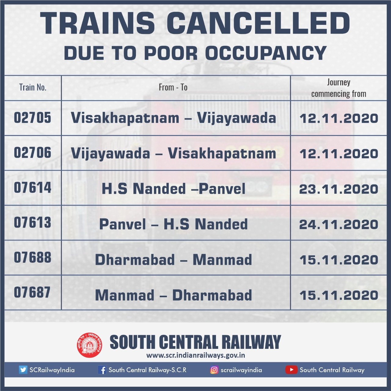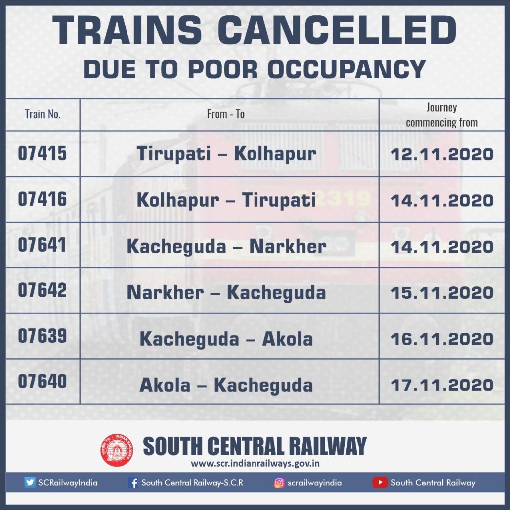 दक्षिण मध्य रेलवे अपनी छह जोड़ी गाड़ियाँ, ” पुअर रिस्पॉन्स” याने यात्रिओंकी अनुपस्थिति का कारण बता कर रद्द करने जा रही है।