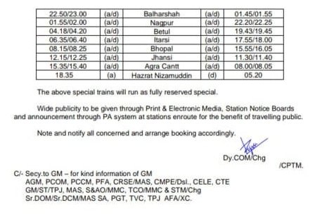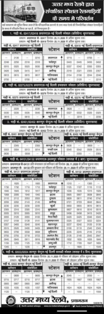 उत्तर मध्य रेलवे की 4 जोड़ी गाड़ियाँ, 02417/18 प्रयागराज नई दिल्ली प्रयागराज स्पेशल एक्सप्रेस, 02275/76 प्रयागराज नई दिल्ली प्रयागराज दुरन्तो स्पेशल, 02451/52 कानपुर नई दिल्ली कानपुर श्रमशक्ति स्पेशल, 04131/32 प्रयागराज उधमपुर प्रयागराज स्पेशल