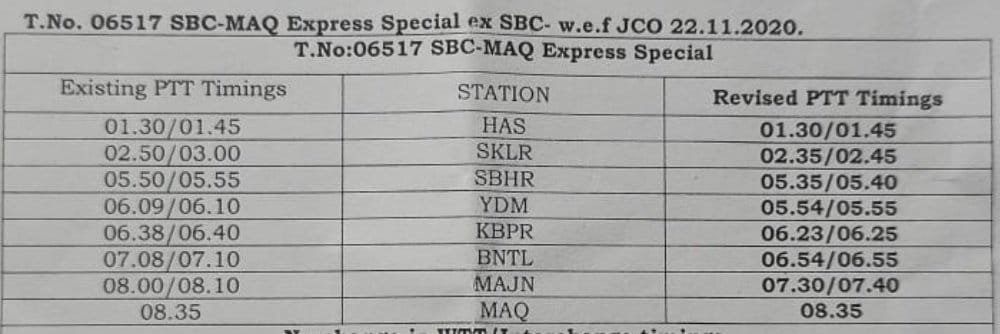 06517 बेंगलुरु मंगालूरु स्पेशल एक्सप्रेस के समयोंमे हसन से लेकर मंगालूरु तक बदलाव हो रहे है।