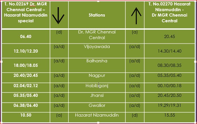 3: 02269/70 एम जी आर चेन्नई सेंट्रल नई दिल्ली एम जी आर चेन्नई सेंट्रल द्विसाप्ताहिक दुरन्तो स्पेशल
