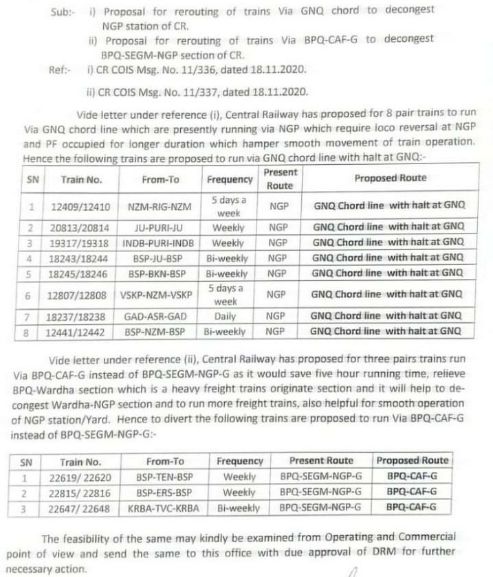 इटारसी – नागपुर – गोंदिया मार्ग पर चलनेवाली 8 जोड़ी गाड़ियाँ नागपुर की जगह गोधनी रुकेगी और नागपुर स्टेशन बाईपास करते हुए चलेगी।