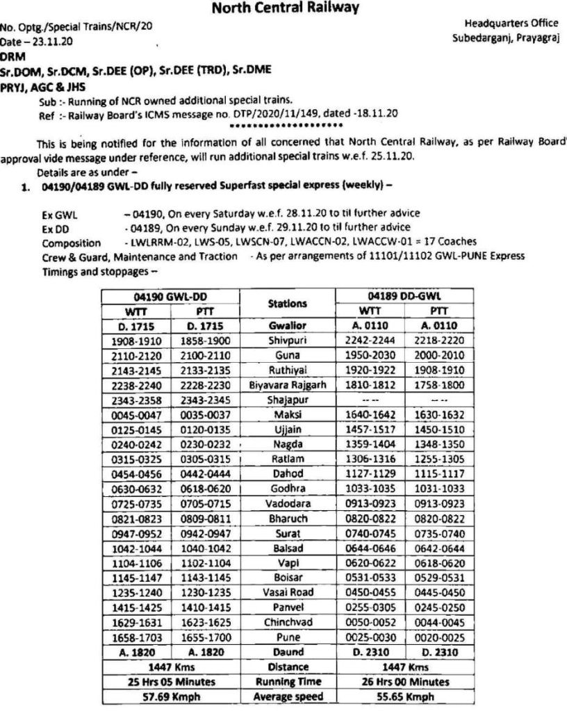 1: 04190/89 ग्वालियर दौंड ग्वालियर साप्ताहिक स्पेशल एक्सप्रेस यह गाड़ी पहले ग्वालियर पुणे के बीच चलती थी जिसे अब दौंड तक विस्तारित किया गया है।