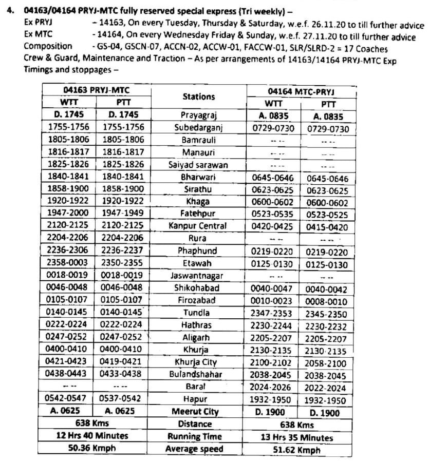 4: 04163/64 प्रयागराज मेरठ सिटी प्रयागराज संगम त्रिसाप्ताहिक स्पेशल, यह गाड़ी पहले प्रतिदिन चलती थी।