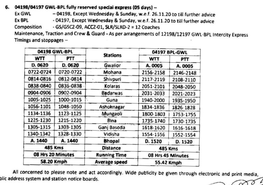6: 04198/97 ग्वालियर भोपाल ग्वालियर इण्टरसिटी स्पेशल, बदले हुए समयसारणी के साथ