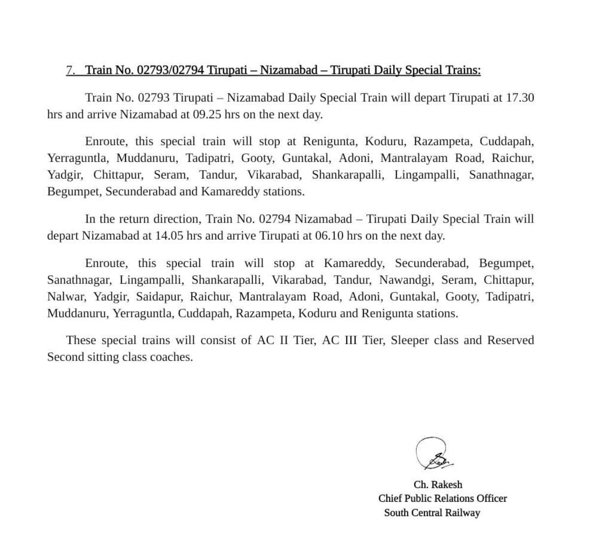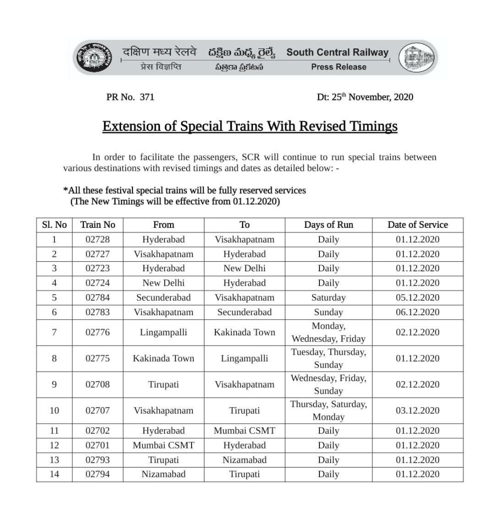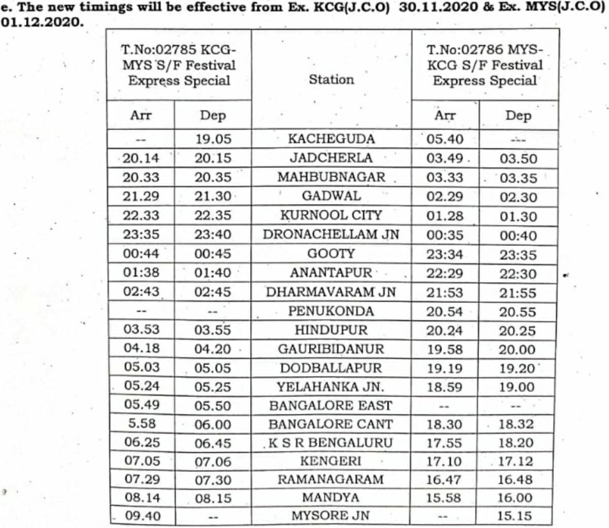 Uncategorisedद म रेल की सात जोड़ी त्यौहार विशेष गाड़ियोंका अवधि बढ़ा 25th Nov 2020 Rail Duniya 02785/86 काचेगुड़ा मैसूरु काचेगुड़ा त्यौहार स्पेशल का समय परिवर्तन Share this: Share on WhatsApp (Opens in new window) WhatsApp Share on X (Opens in new window) X Share on Facebook (Opens in new window) Facebook Share on Telegram (Opens in new window) Telegram Email a link to a friend (Opens in new window) Email Like Loading... Related Published by Rail Duniya Rail Duniya is a magazine publishing all India train timings since 1988. View all posts by Rail Duniya