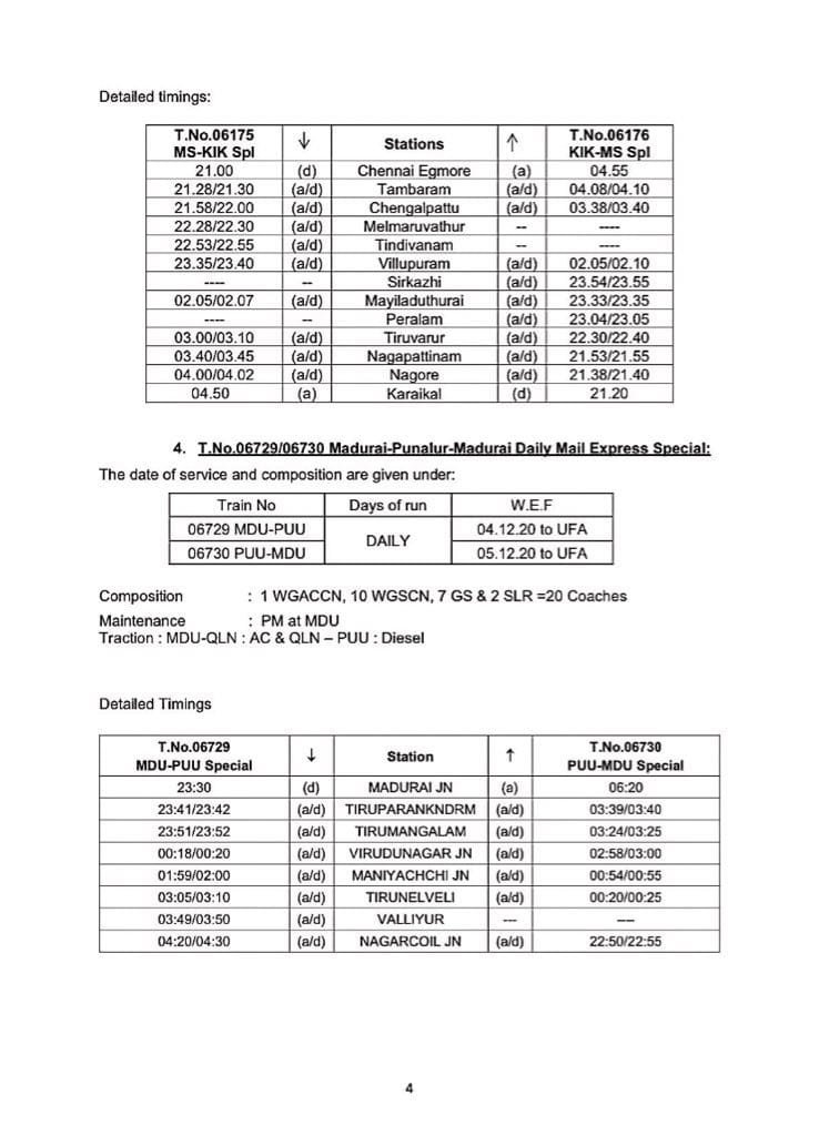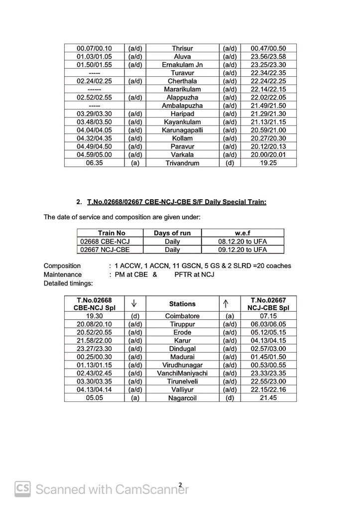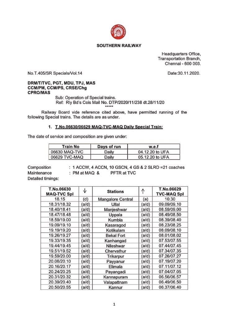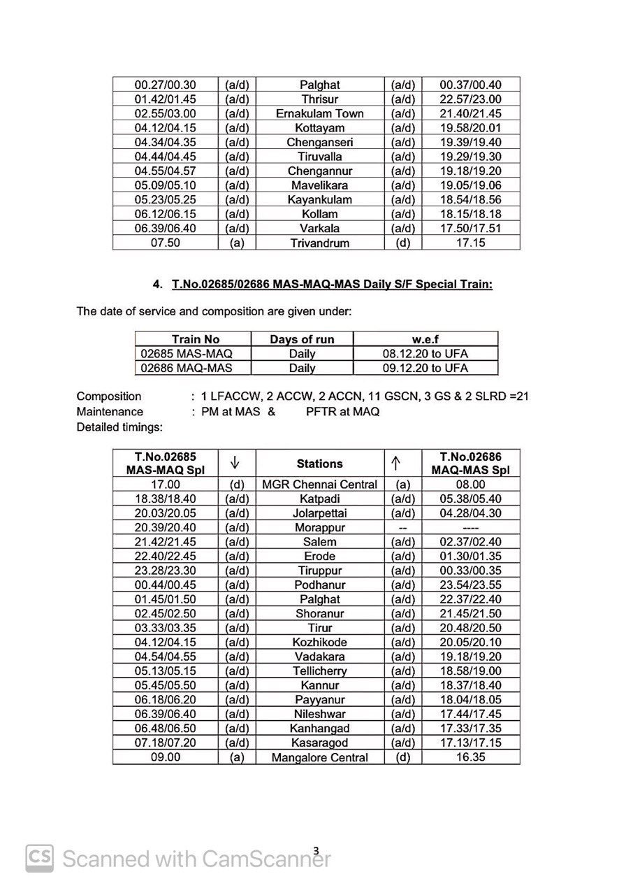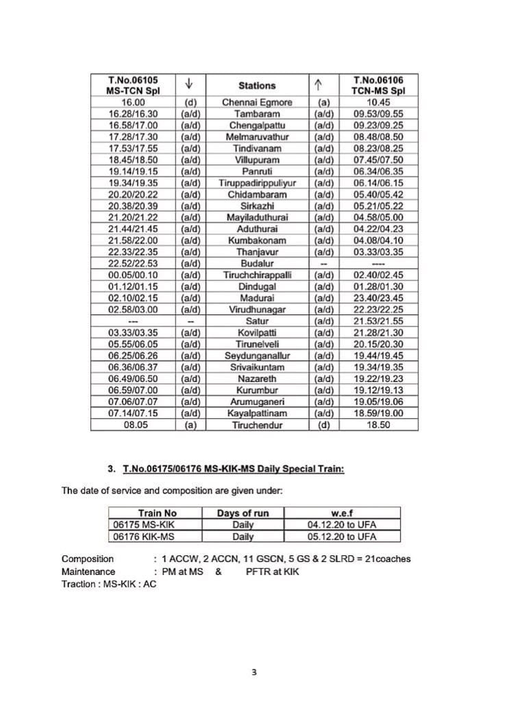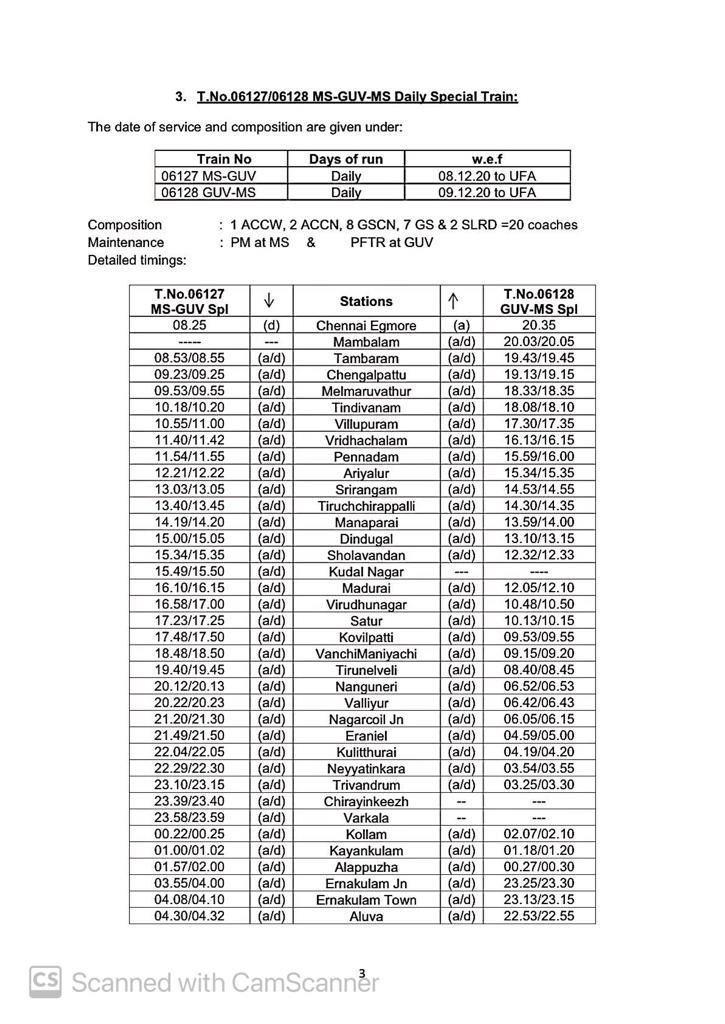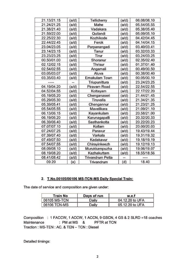 06630/29 मंगालूरु तिरुवनंतपुरम मंगालूरु प्रतिदिन, 06105/06 चेन्नई एगमोर तिरुचेन्दूर चेन्नई एगमोर प्रतिदिन, 06175/76 चेन्नई एगमोर कराईकल चेन्नई एगमोर प्रतिदिन, 06729/30 मदुरै पुनल्लूर मदुरै प्रतिदिन, 06603/04 मंगालूरु तिरुवनंतपुरम मंगालूरु प्रतिदिन, 02668/67 कोयम्बटूर नागरकोईल कोयम्बटूर प्रतिदिन, 06127/28 चेन्नई एगमोर गुरुवयूर चेन्नई एगमोर प्रतिदिन, 06851/52 चेन्नई एगमोर रामेश्वरम चेन्नई एगमोर प्रतिदिन, 06063/64 चेन्नई एगमोर नागरकोईल चेन्नई एगमोर साप्ताहिक, 06179/80 चेन्नई एगमोर मन्नारगुड़ी चेन्नई एगमोर प्रतिदिन, 02695/96 एम जी आर चेन्नई सेंट्रल तिरुवनंतपुरम एम जी आर चेन्नई सेंट्रल प्रतिदिन, 02685/86 एम जी आर चेन्नई सेंट्रल मंगालूरु सेंट्रल एम जी आर चेन्नई सेंट्रल प्रतिदिन, 02651/52 एम जी आर चेन्नई सेंट्रल पालक्कड़ एम जी आर चेन्नई सेंट्रल प्रतिदिन यह सभी 13 जोड़ी गाड़ियाँ है जो पहले दिसम्बर से आरक्षित आसन व्यवस्थाओंके साथ शुरू होने जा रही है।