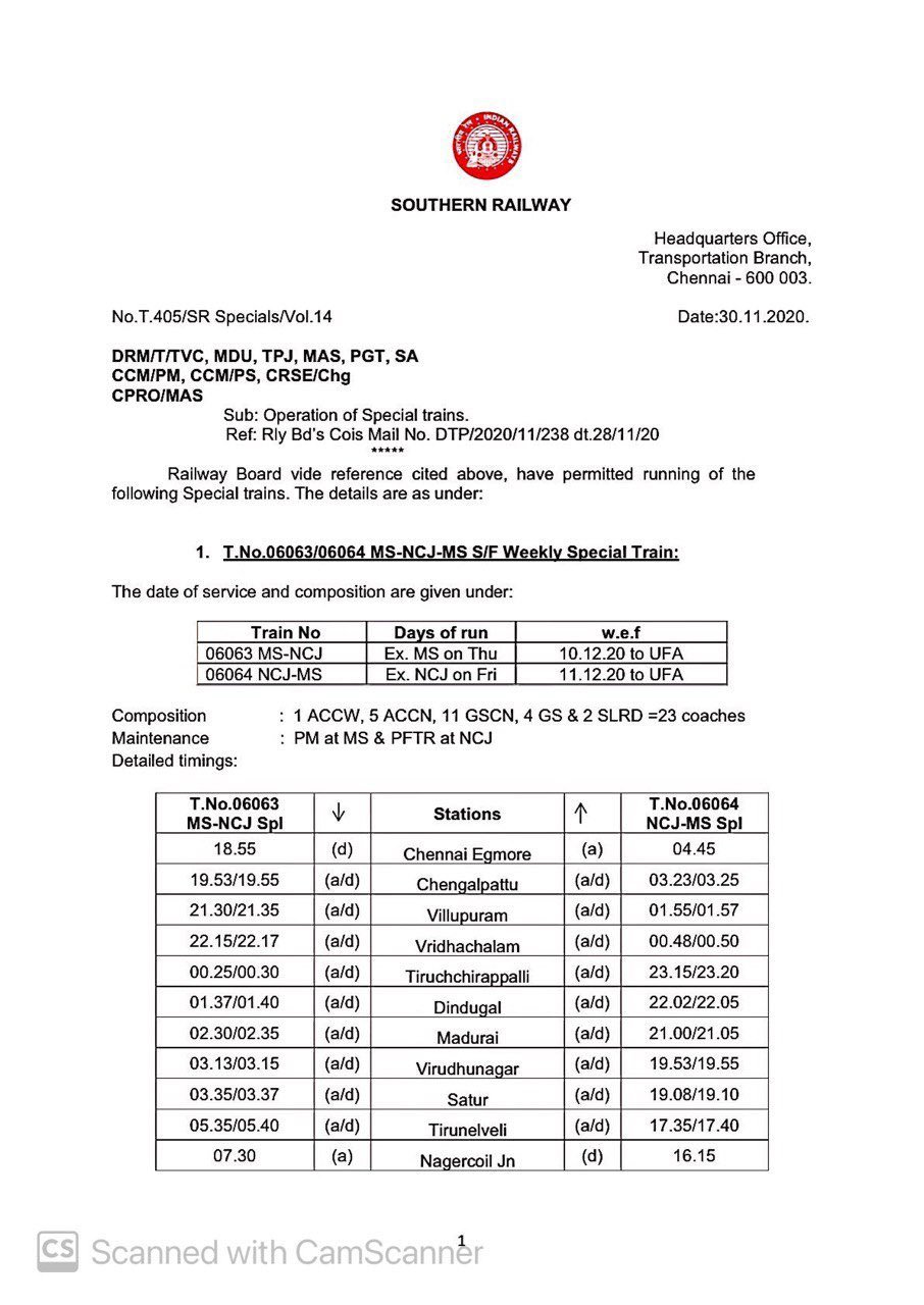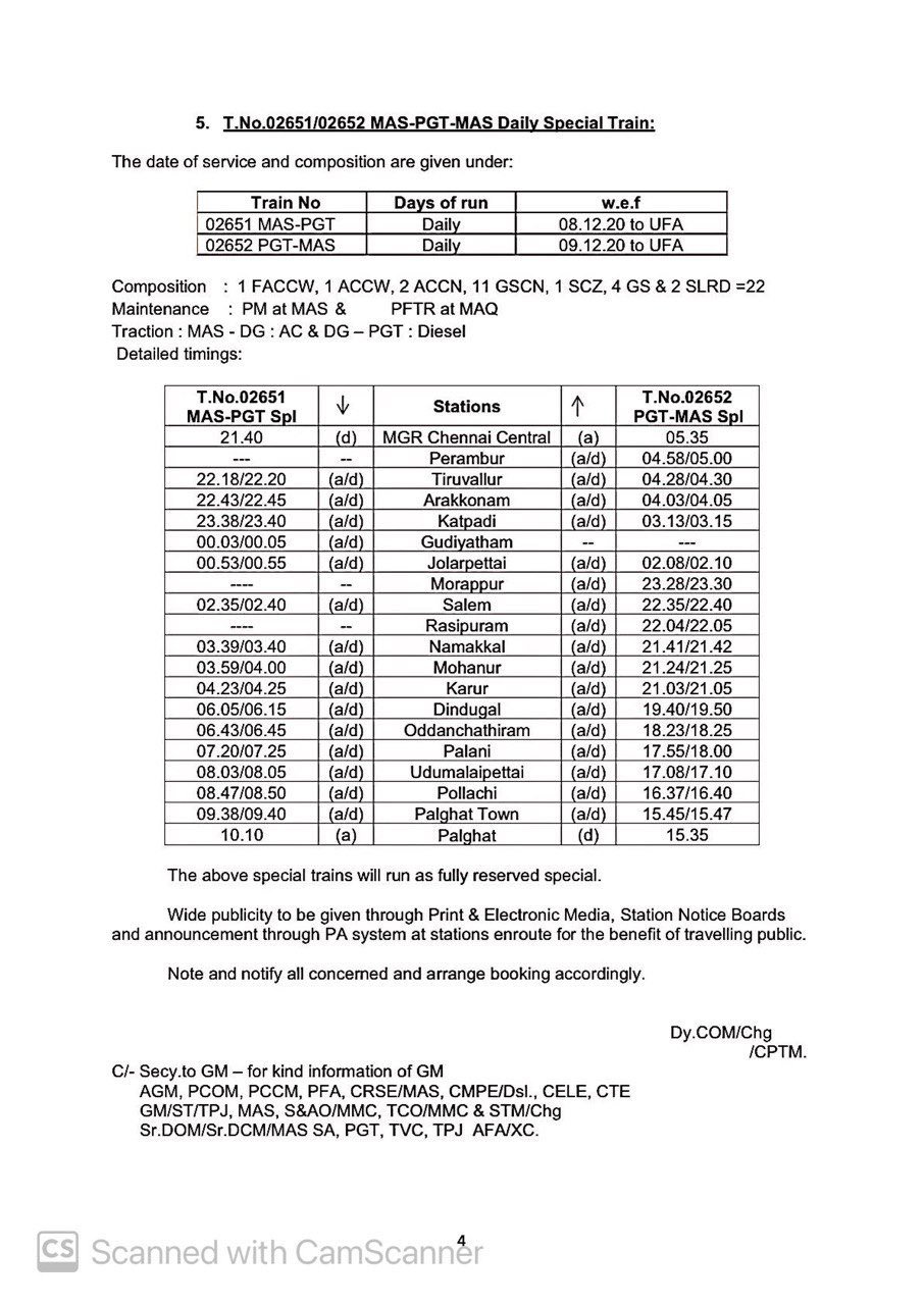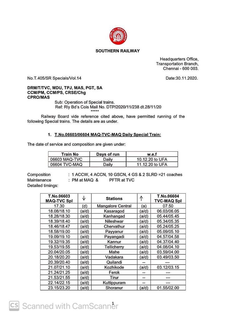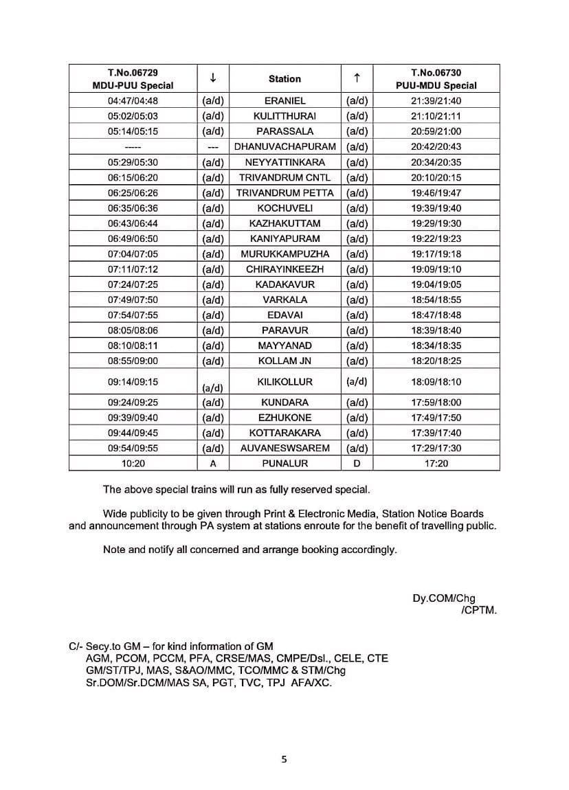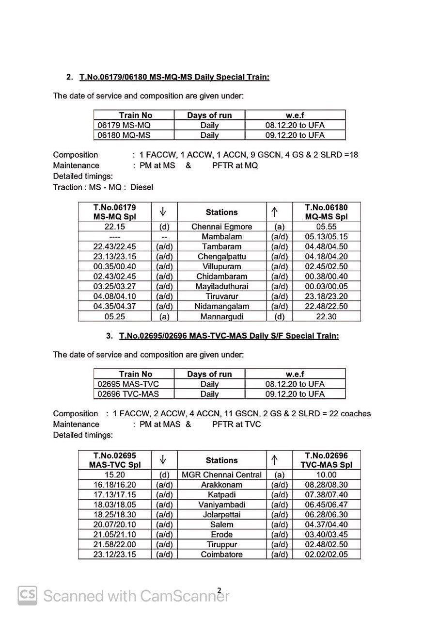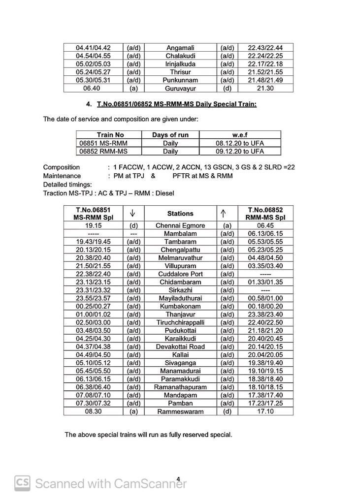 06630/29 मंगालूरु तिरुवनंतपुरम मंगालूरु प्रतिदिन, 06105/06 चेन्नई एगमोर तिरुचेन्दूर चेन्नई एगमोर प्रतिदिन, 06175/76 चेन्नई एगमोर कराईकल चेन्नई एगमोर प्रतिदिन, 06729/30 मदुरै पुनल्लूर मदुरै प्रतिदिन, 06603/04 मंगालूरु तिरुवनंतपुरम मंगालूरु प्रतिदिन, 02668/67 कोयम्बटूर नागरकोईल कोयम्बटूर प्रतिदिन, 06127/28 चेन्नई एगमोर गुरुवयूर चेन्नई एगमोर प्रतिदिन, 06851/52 चेन्नई एगमोर रामेश्वरम चेन्नई एगमोर प्रतिदिन, 06063/64 चेन्नई एगमोर नागरकोईल चेन्नई एगमोर साप्ताहिक, 06179/80 चेन्नई एगमोर मन्नारगुड़ी चेन्नई एगमोर प्रतिदिन, 02695/96 एम जी आर चेन्नई सेंट्रल तिरुवनंतपुरम एम जी आर चेन्नई सेंट्रल प्रतिदिन, 02685/86 एम जी आर चेन्नई सेंट्रल मंगालूरु सेंट्रल एम जी आर चेन्नई सेंट्रल प्रतिदिन, 02651/52 एम जी आर चेन्नई सेंट्रल पालक्कड़ एम जी आर चेन्नई सेंट्रल प्रतिदिन यह सभी 13 जोड़ी गाड़ियाँ है जो पहले दिसम्बर से आरक्षित आसन व्यवस्थाओंके साथ शुरू होने जा रही है।
