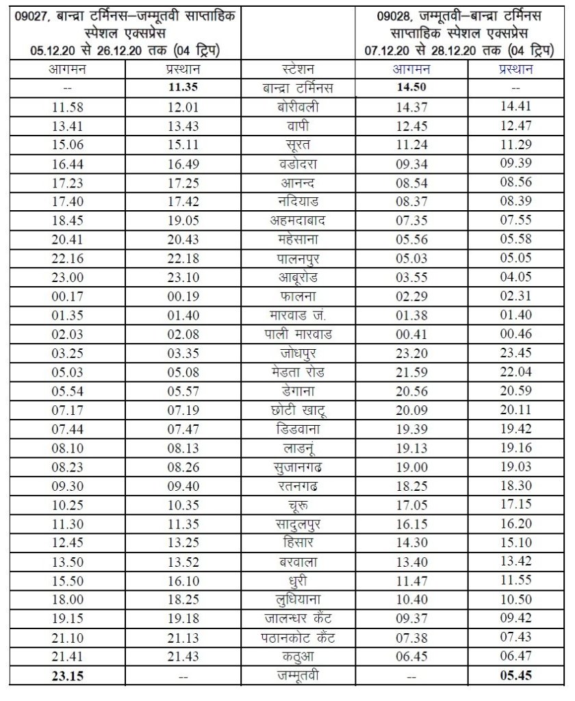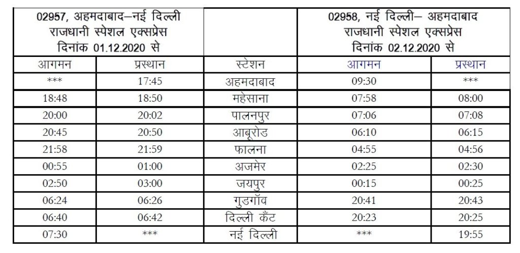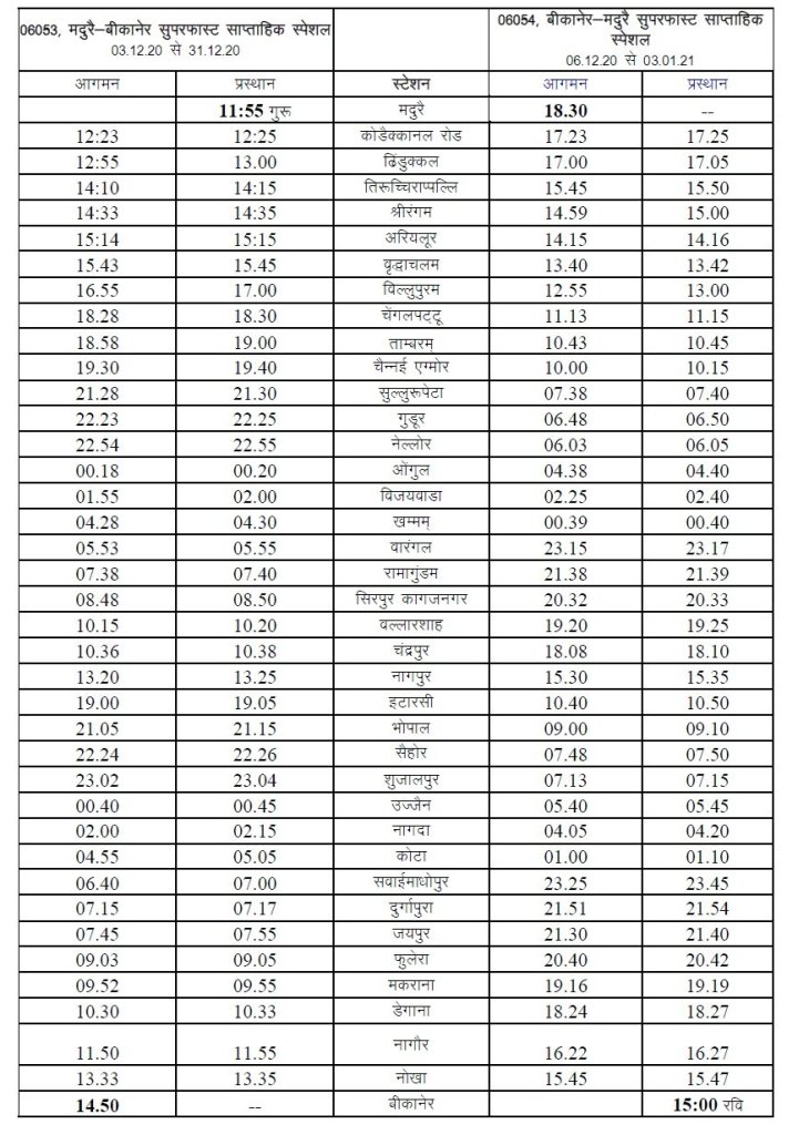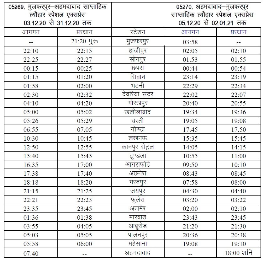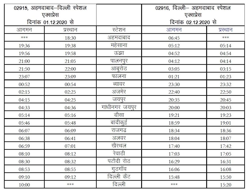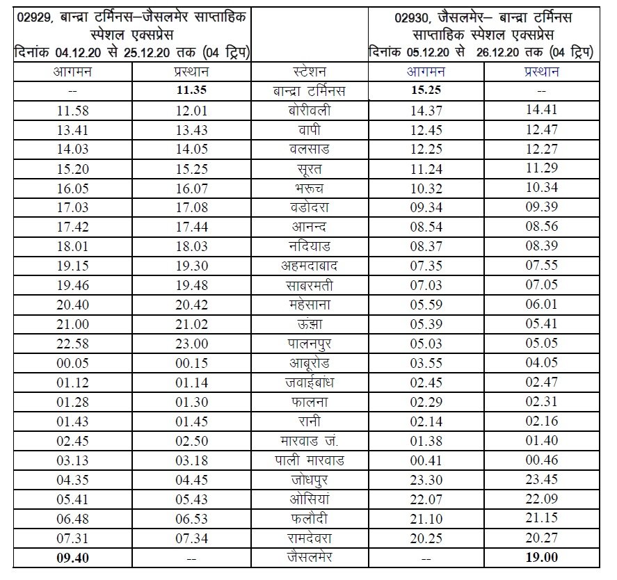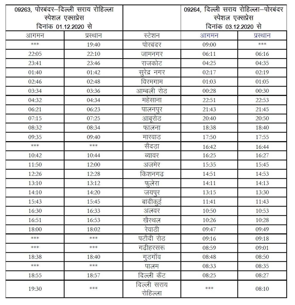 1: 02929/30 बांद्रा जैसलमेर बांद्रा त्यौहार विशेष, 2: 09027/28 बांद्रा जम्मूतवी बांद्रा त्यौहार विशेष, 3: 05269/70 मुजफ्फरपुर अहमदाबाद मुजफ्फरपुर त्यौहार विशेष, 4: 02395/96 राजेंद्रनगर अजमेर राजेंद्रनगर त्यौहार विशेष, 5: 06053/54 मदुरै बीकानेर मदुरै त्यौहार विशेष, 6: 02957/58 अहमदाबाद नई दिल्ली अहमदाबाद राजधानी विशेष, 7: 02915/16 अहमदाबाद नई दिल्ली अहमदाबाद आश्रम विशेष, 8: 09263/64 पोरबंदर दिल्ली सराय रोहिल्ला पोरबंदर विशेष