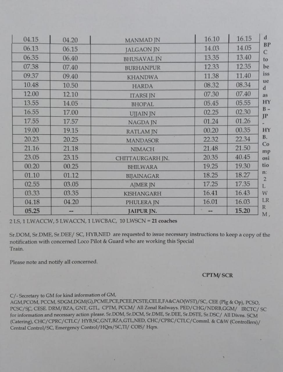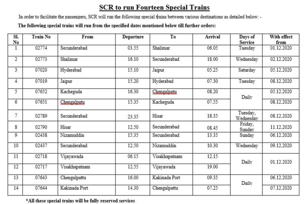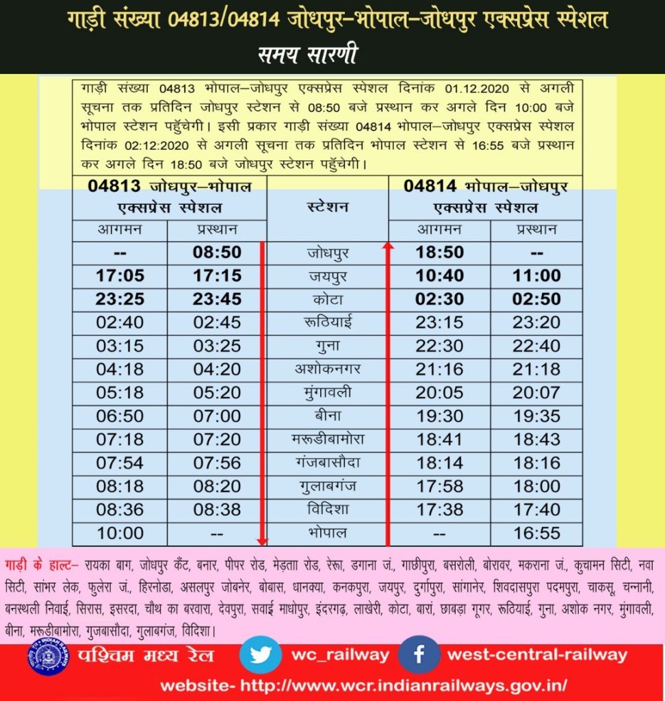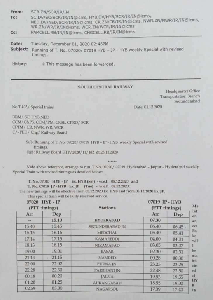 07019/20 हैदराबाद-जयपुर साप्ताहिक स्पेशल व्हाया मनमाड़-भुसावल का परिचालन 5 दिसंबर से पुनः शुरू किया जा रहा है। ट्रेन संख्या 07020 खंडवा 6 दिसंबर को सुबह 9.40 बजे पहुँचकर जयपुर के लिये रवाना होंगी। वापसी की 17019 जयपुर से निकलकर खंडवा सुबह 11.40 बजे 9 तारीख को आयेगी। 02719/20 द्वि साप्ताहिक के अतिरिक्त चलेंगी। (मनोज सोनी द्वारा प्रेषित)
