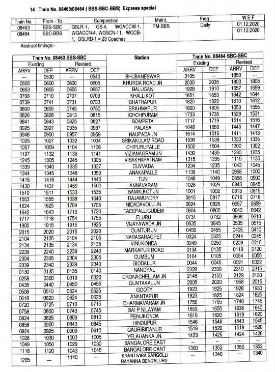11: 08463/64 भुबनेश्वर क्रांतिवीर सांगोली रायन्ना बेंगालुरु भुबनेश्वर