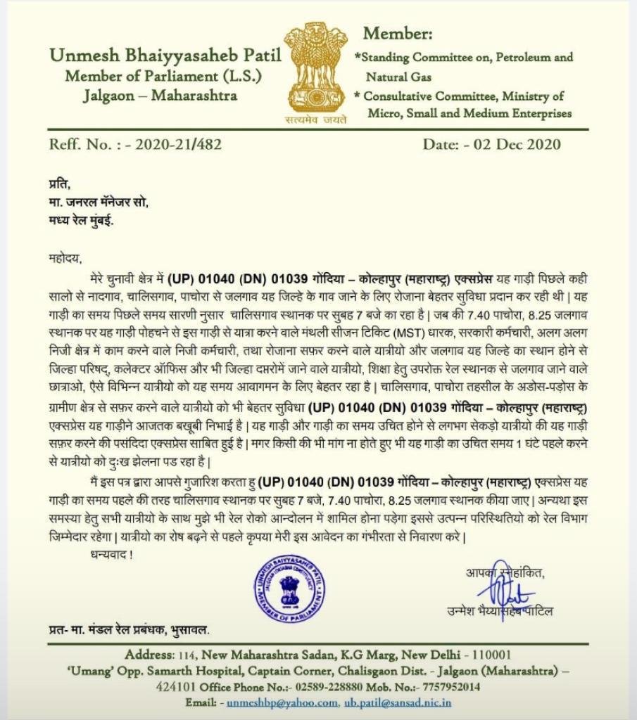यह एक स्थानीय सांसद का जनरल मैनेजर मध्य रेलवे को भेजा गया पत्र है, जो सोशल मीडिया में ट्रेंड कर रहा है। कोल्हापुर गोंदिया महाराष्ट्र एक्सप्रेस बदलाव के बाद पुराने समय से करीबन 60 से 90 मिनट पहले चलेगी, जिसे अपने पुराने समयसे चलाने की स्थानीय लोंगोंकी माँग को आगे बढ़ाया गया है।