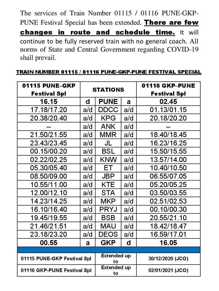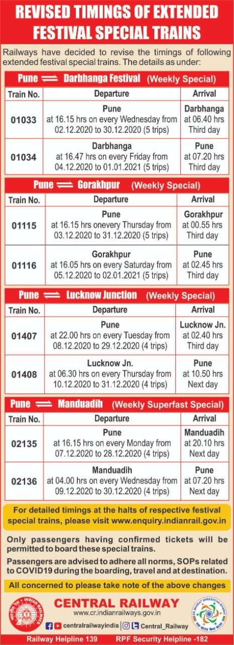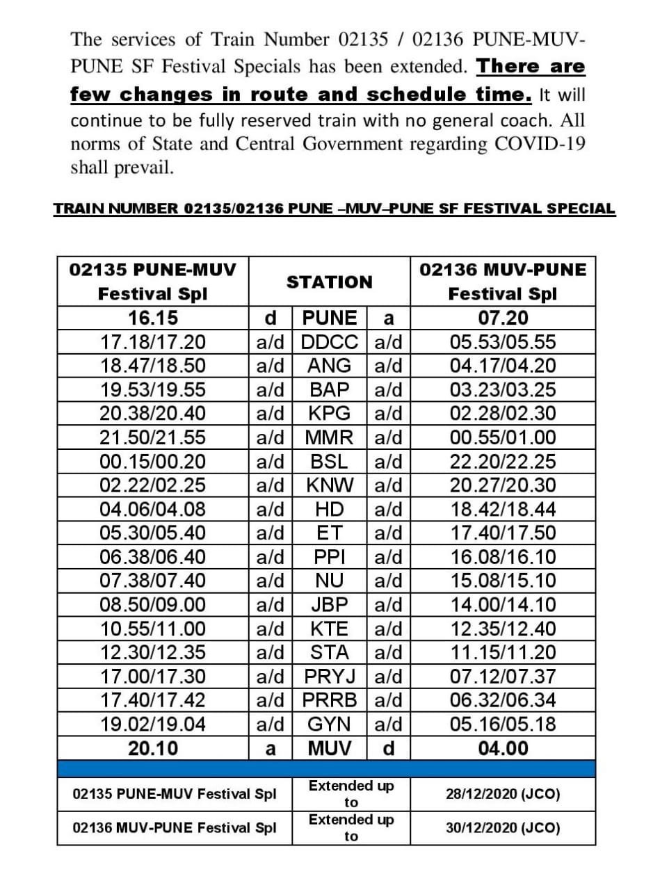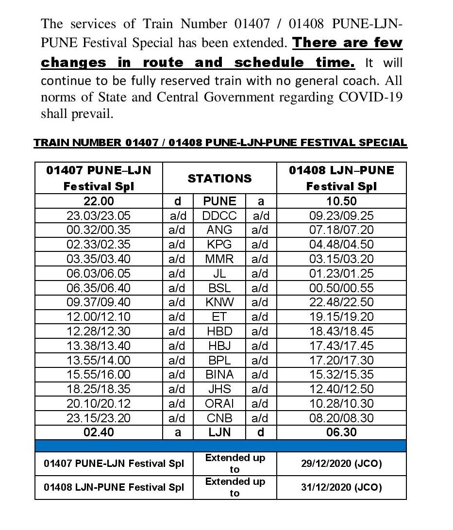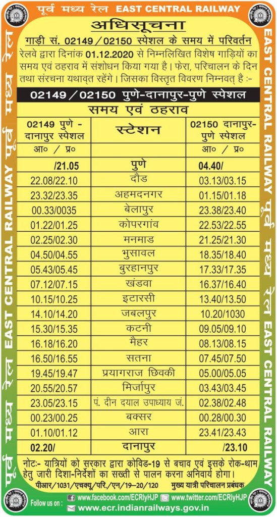 Uncategorisedपुणेकर, और पुणे के रेल यात्री कृपया अपनी गाड़ियोंके समय परिवर्तन पर ध्यान दे। 4th Dec 2020 Rail Duniya 02149/50 पुणे दानापुर पुणे स्पेशल में समय बदला गया है, साथ ही त्यौहार विशेष गाड़ियोंका भी अवधि बढाया गया है। Share this: Share on WhatsApp (Opens in new window) WhatsApp Share on X (Opens in new window) X Share on Facebook (Opens in new window) Facebook Share on Telegram (Opens in new window) Telegram Email a link to a friend (Opens in new window) Email Like Loading... Related Published by Rail Duniya Rail Duniya is a magazine publishing all India train timings since 1988. View all posts by Rail Duniya