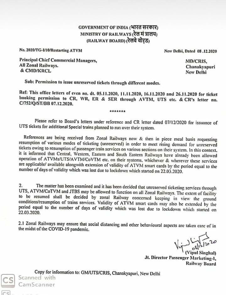 दरअसल मध्य रेल, पश्चिम रेल, पूर्व एवं दक्षिण पूर्व रेल इन क्षेत्रोंमें सबअर्बन गाड़ियाँ चलाई जा रही है, उनके टिकिटिंग ATVM और UTS ऐसी संगणकीय व्यवस्थाओंका व्यवस्थापन किस तरह से करना है और बचे बाकी क्षेत्रीय रेल्वेज में भी इन्हें शुरू करने का आदेश है। उपरोक्त रेल के कार्यक्षेत्र में जहाँ नॉन सबअर्बन सेक्शन्स है, उन में अभी भी सवारी गाड़ियाँ या विशेष गाड़ियोंमे द्वितीय श्रेणी की टिकिटिंग शुरू नही है। विशेष बात यह है, इन खंडोंसे गुजरनेवाली गाड़ियोंमे अभी भी द्वितीय श्रेणी याने अनारक्षित वर्ग मौजूद नही है तो उनके तिकीटोंका सवाल ही नही आता।