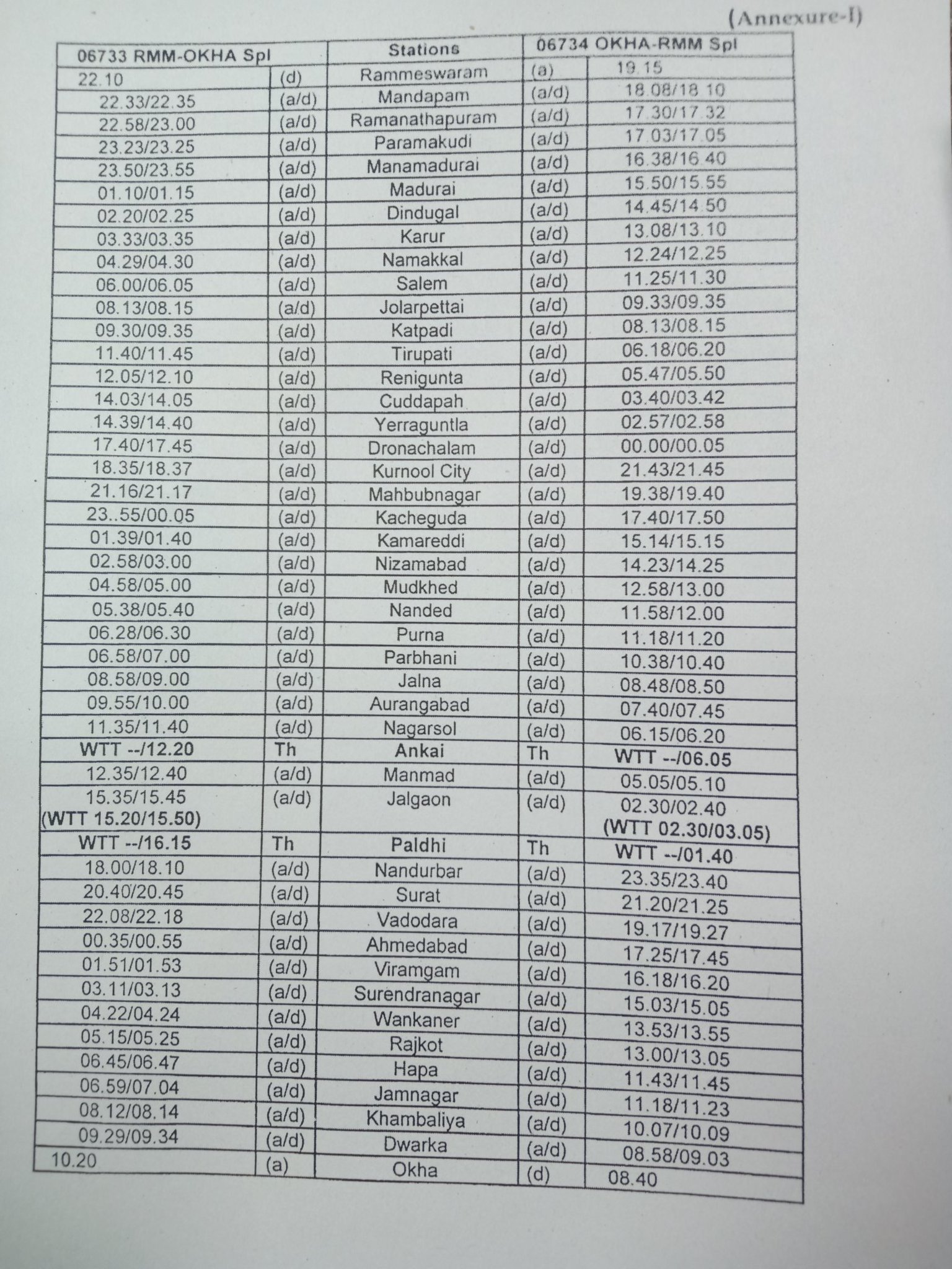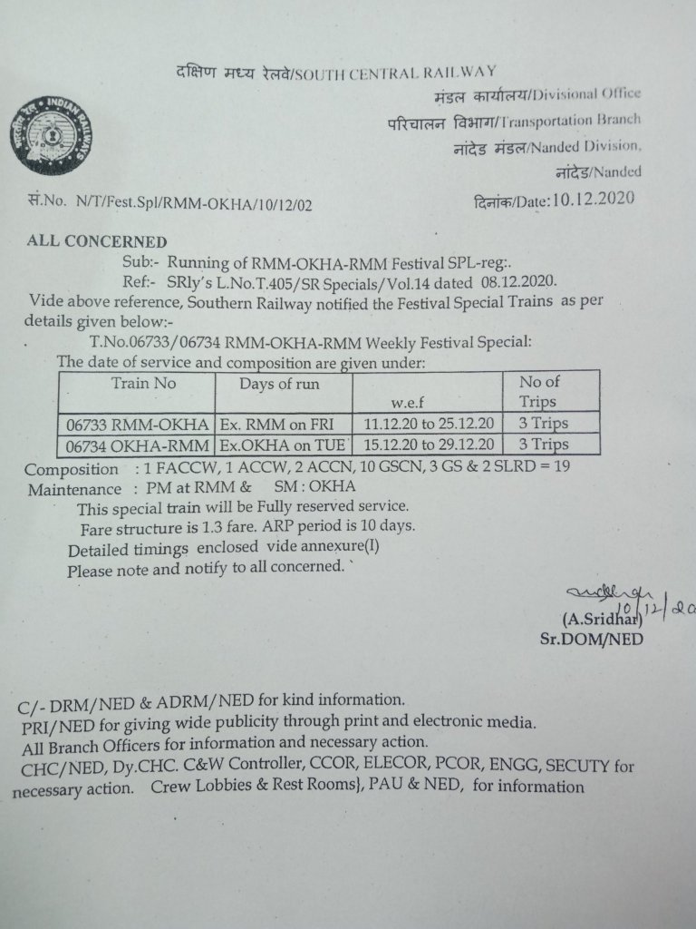 06733/34 रामेश्वरम ओखा रामेश्वरम त्यौहार विशेष केवल 3 फेरे करेंगी। रामेश्वरम से 11,18 और 25 दिसम्बर शुक्रवारको निकलेगी और ओख़ासे 15, 22 और 29 मंगलवारको निकलेगी। यह गाड़ी पूर्णतयः आरक्षित आसन व्यवस्थाओं के साथ, विशेष किराया दर से चलाई जाएगी।
