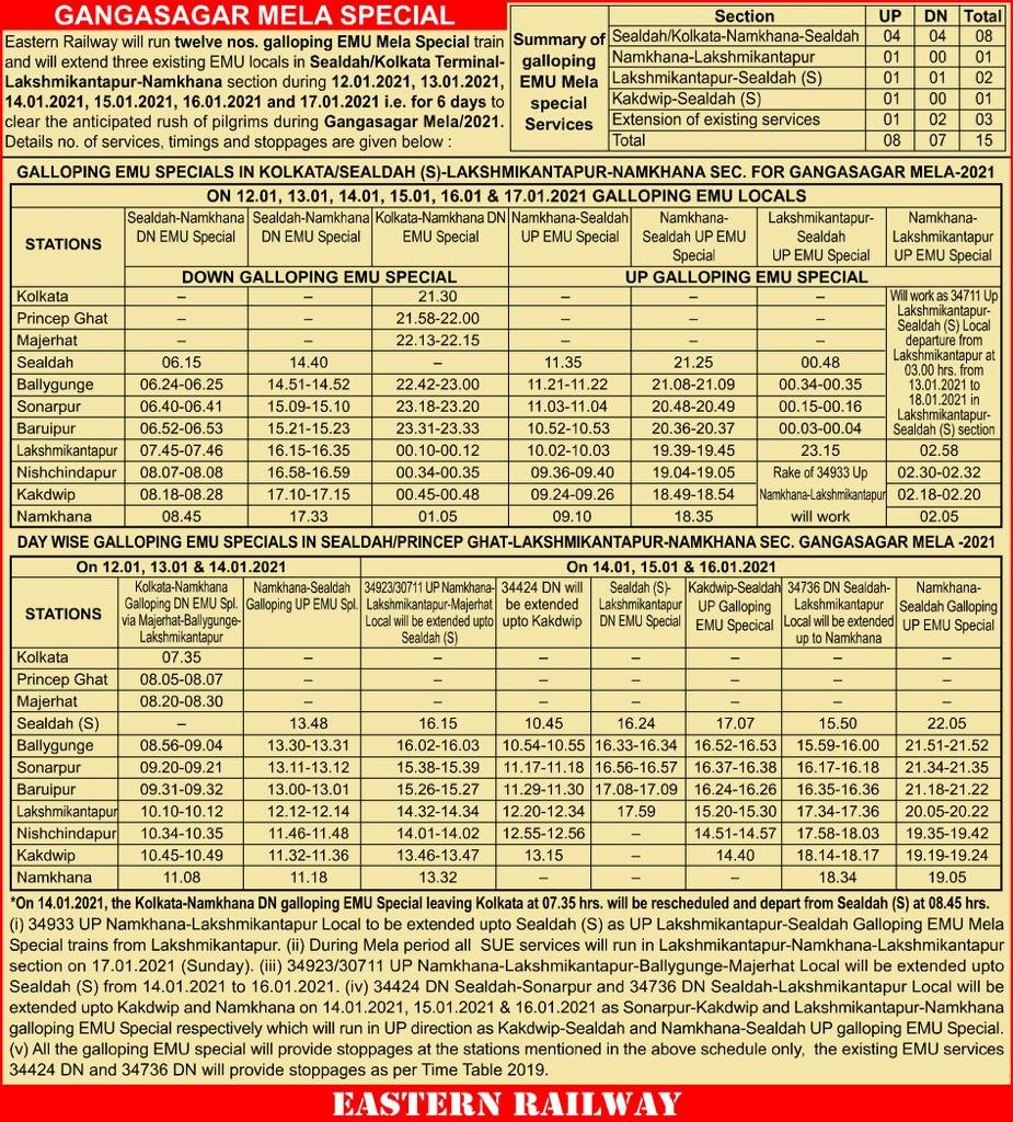 गंगासागर तीर्थ में कपिल मुनि का मंदिर है और गंगा नदी का सागर संगम है। हावडा से नामखाना की उपनगरीय गाड़ियोंका टेबल यहाँपर दे रहे है।